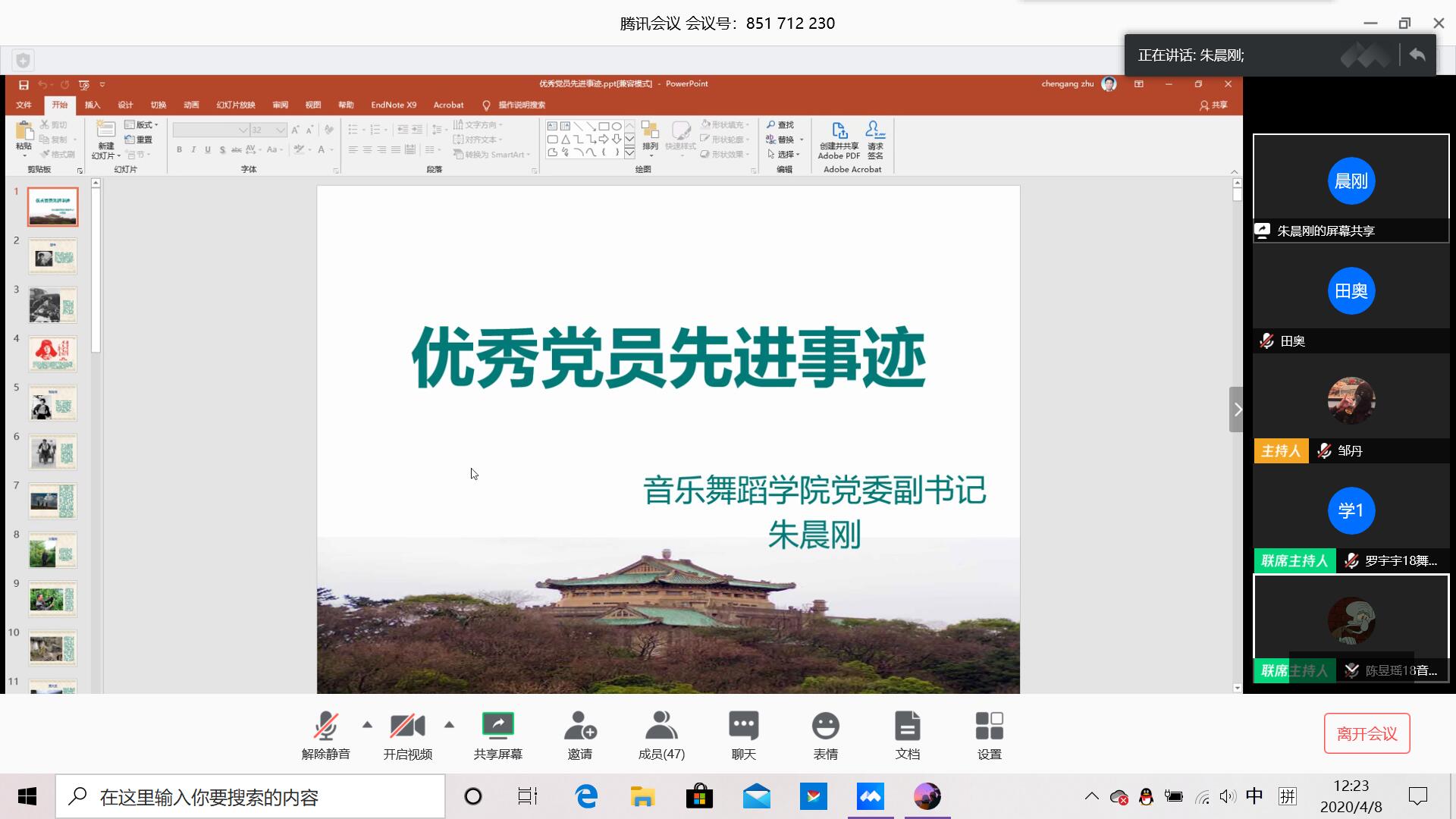 4月8日中午12点77779193永利官网集团在腾讯会议举行了第49期入党积极分子专题讲座。由党委书记朱晨刚担任主讲人,并展开了优秀党员先进事迹的专题讲座。