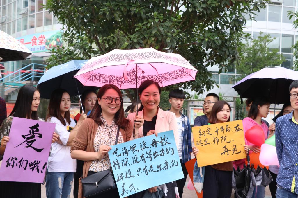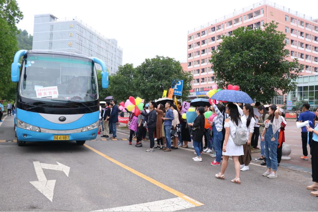 前来送行的同学们高举自己亲笔书写的寄语、飘扬着手绘的彩旗、手持气球、饱含深情的唱响《一路顺风》、《友谊天长地久》......尽管雨滴打湿了衣裳,却没有冷却大家的热情,激扬的歌声、难舍的话语也使得毕业生们迟迟徘徊在校车旁,不忍离去!