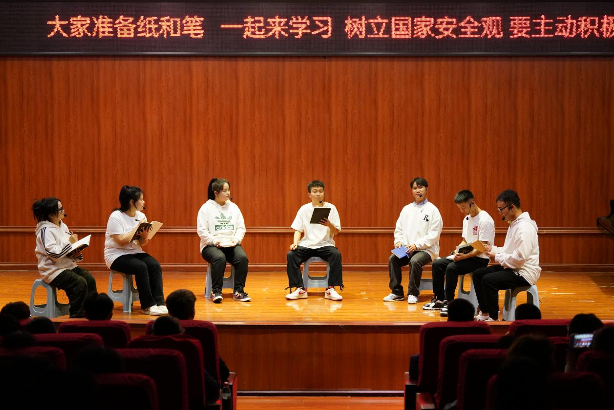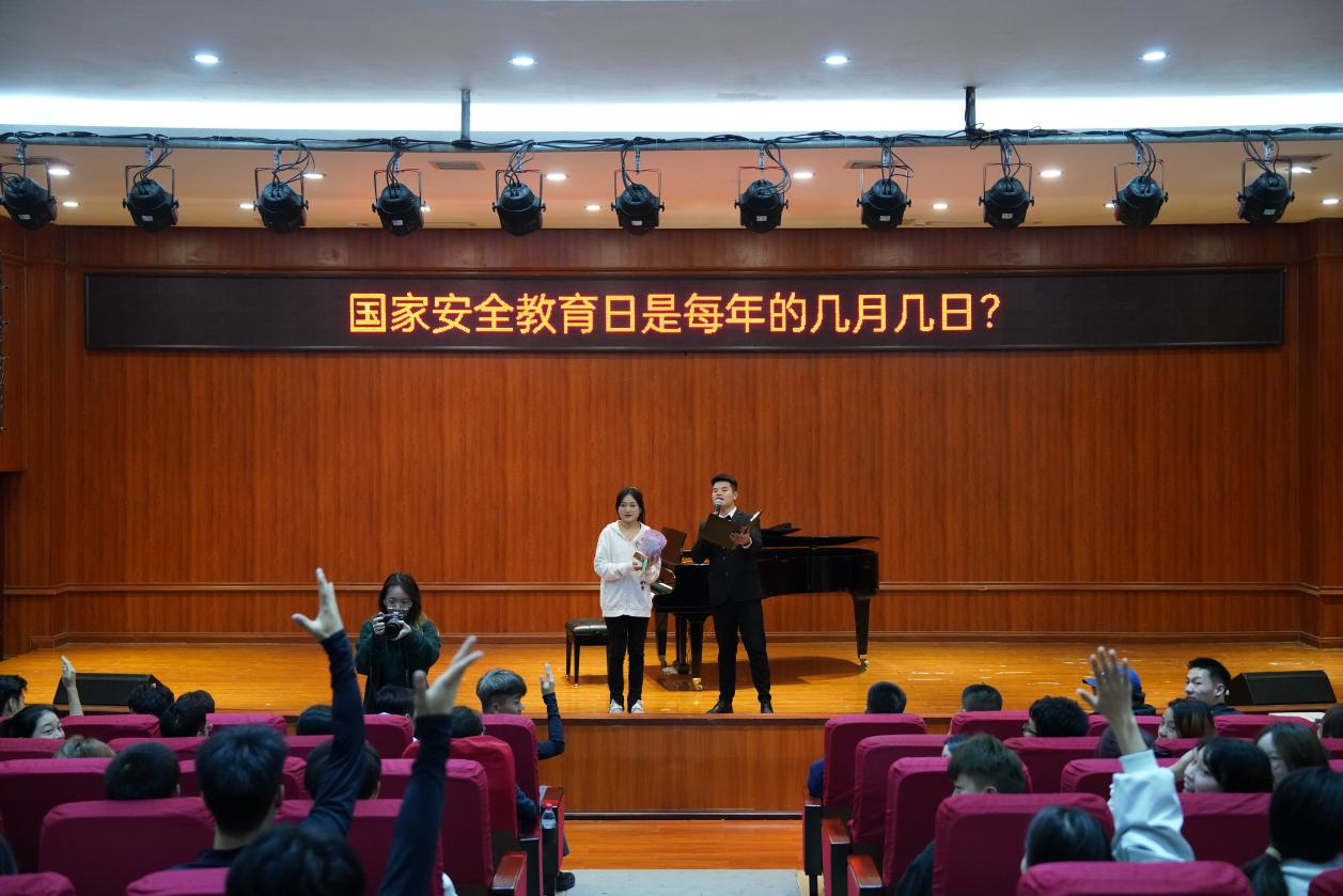 本次团日活动以文艺展演的形式浸润“国家安全人人有责”的主体观,整场节目立意新颖、丰富多彩,涵盖了合唱、朗诵、钢琴四手联弹和新说唱等。其中,由李晓艳等同学带来的合唱《有我》激昂感人,表达了青年一代对国家清澈而真挚的爱;党团青年代表朗诵的《国家安全人人有责》铿锵有力,唤起了在场每一个人对国家安全的重视;钢琴四手联弹《花儿为什么这样红》在曹青华同同学的舞姿中尽显青春活力;杨宇航等党团学生干部原创的新说唱《我的国家安全观》以本土方言+Rap的独特表达方式,将现场气氛推向高潮,全体师生在轻松愉悦的说唱氛围中,深化了居安思危的思想。演出期间,彭启林同学化身“国家安全宣传员”,以趣味互动问答的形式,进一步厚植了“树立国家安全观·共创安全新局面”的主题思想,同学们踊跃举手、争先回答,现场氛围活力四射、热烈激扬。活动在温馨感人的歌曲《国家》中圆满结束。