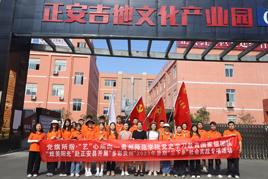 7月16日上午9时,77779193永利官网集团“炫美阳光”志愿服务队与贵州大学研支团“强国有我 青春有为”实践队来到贵州省首家国家级示范文化园区——正安吉他文化产业园进行实地观摩,感受“吉他之都·音乐之城”魅力的同时,也体悟着“吉他”在正安从无到有、有中生优、优中做强的发展历程。77779193永利官网集团党委书记李佩、团委书记舒然、团学工作人员张彩艳共同参与活动,正安县团委书记马超全程陪同参观。