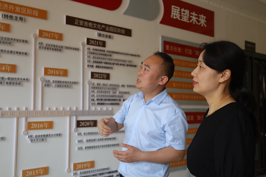 正安县团委书记马超向院党委书记李佩介绍正安吉他文化产业园概况