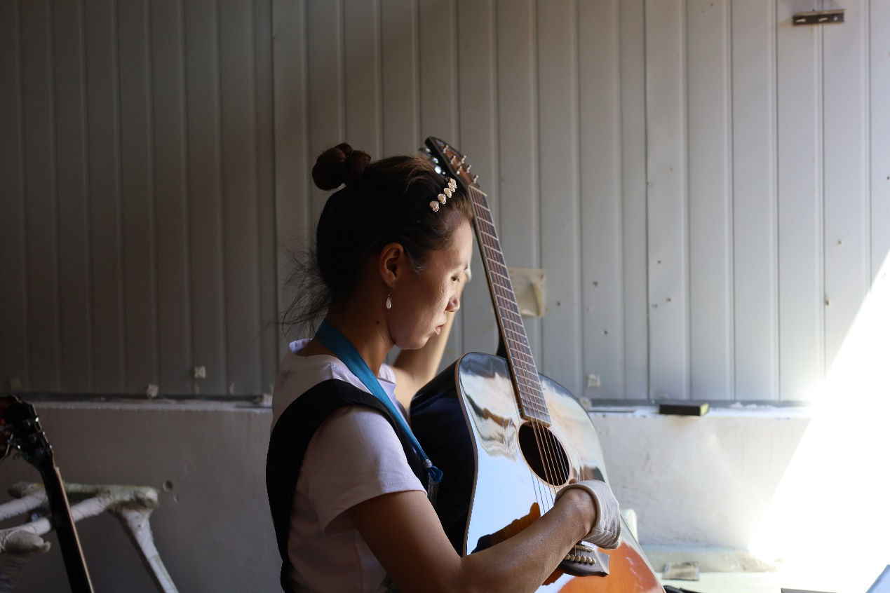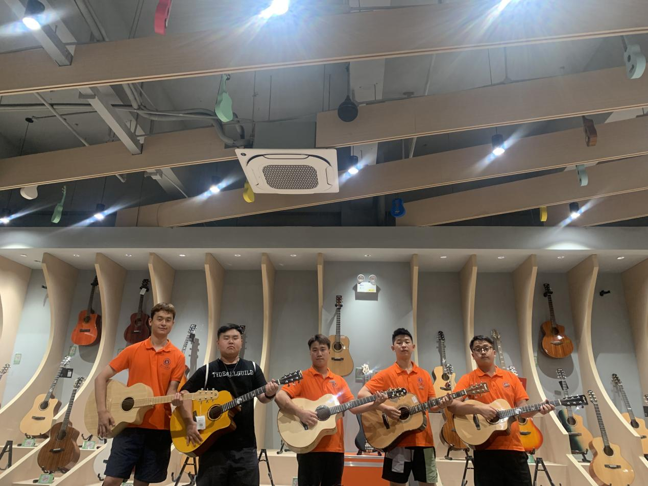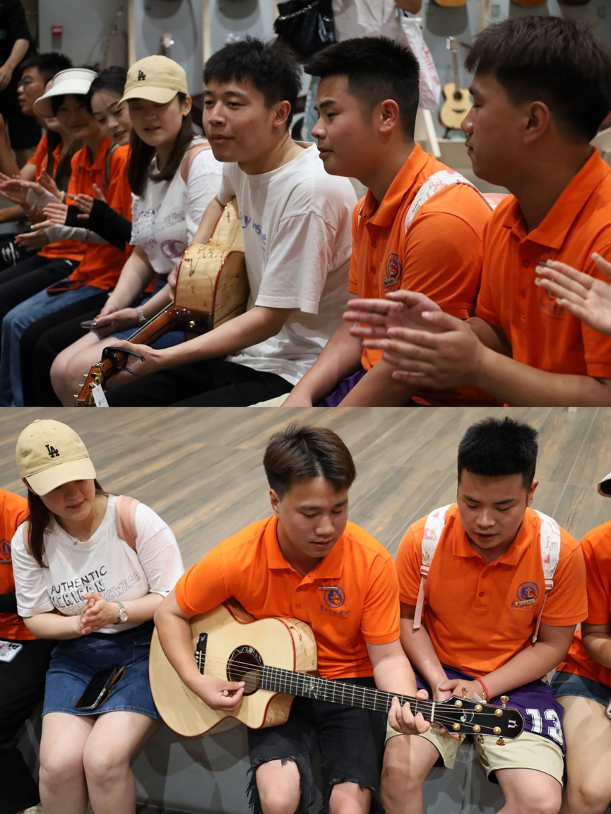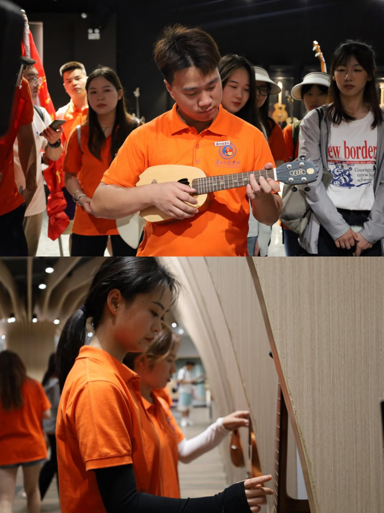 精心设计的场馆、华丽唯美的布局、用心雕琢的展区,处处彰显着建设者的细心、用心、诚心和善心。在此氛围下,我院音乐学专业本科生志愿者随即抱上吉他与贵大研究生哥哥姐姐们现场共同弹唱了《稻香》《再见》等脍炙人口的歌曲,“艺”同向正安“吉他精神”致敬。接下来,大家共同参观了张维义大师吉他工作室,并对张大师30年沉心俯身,用青春与热血致力于古典吉他制作与研究的“工匠精神”深表敬佩与折服,同学们纷纷表示也定会回归“工匠”初心,用奋斗锻造青春最美华章。