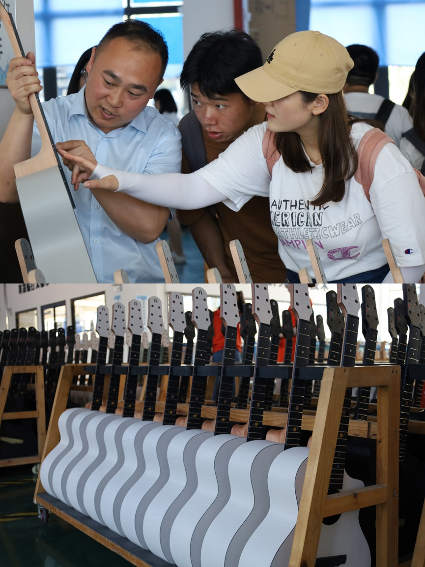 随后,大家前往吉他生产基地,现场观摩了吉他抛光、打孔、上漆、制弦等制造过程,看到工人们娴熟的操作、细心的复核、专业的调音,也终于明白为什么正安能在10年间,吉他制造及配套企业能实现从0到1的突破、从1到126的发展;为什么正安能年产吉他600万把,成为如今全球最集聚、最大的吉他生产基地的真正原因。最后,活动在观摩完正安自主研发、本土原创吉他品牌“娜塔莎”企业后圆满结束,全体同学合影留念并齐声高喊“娜塔莎加油,你一定会走向世界!”此举也向正安无数致力于从“制”造走向“智”造、从贴牌代工走向自创品牌的本土企业们呐喊、助力。