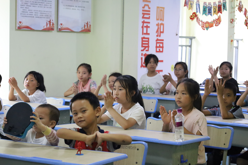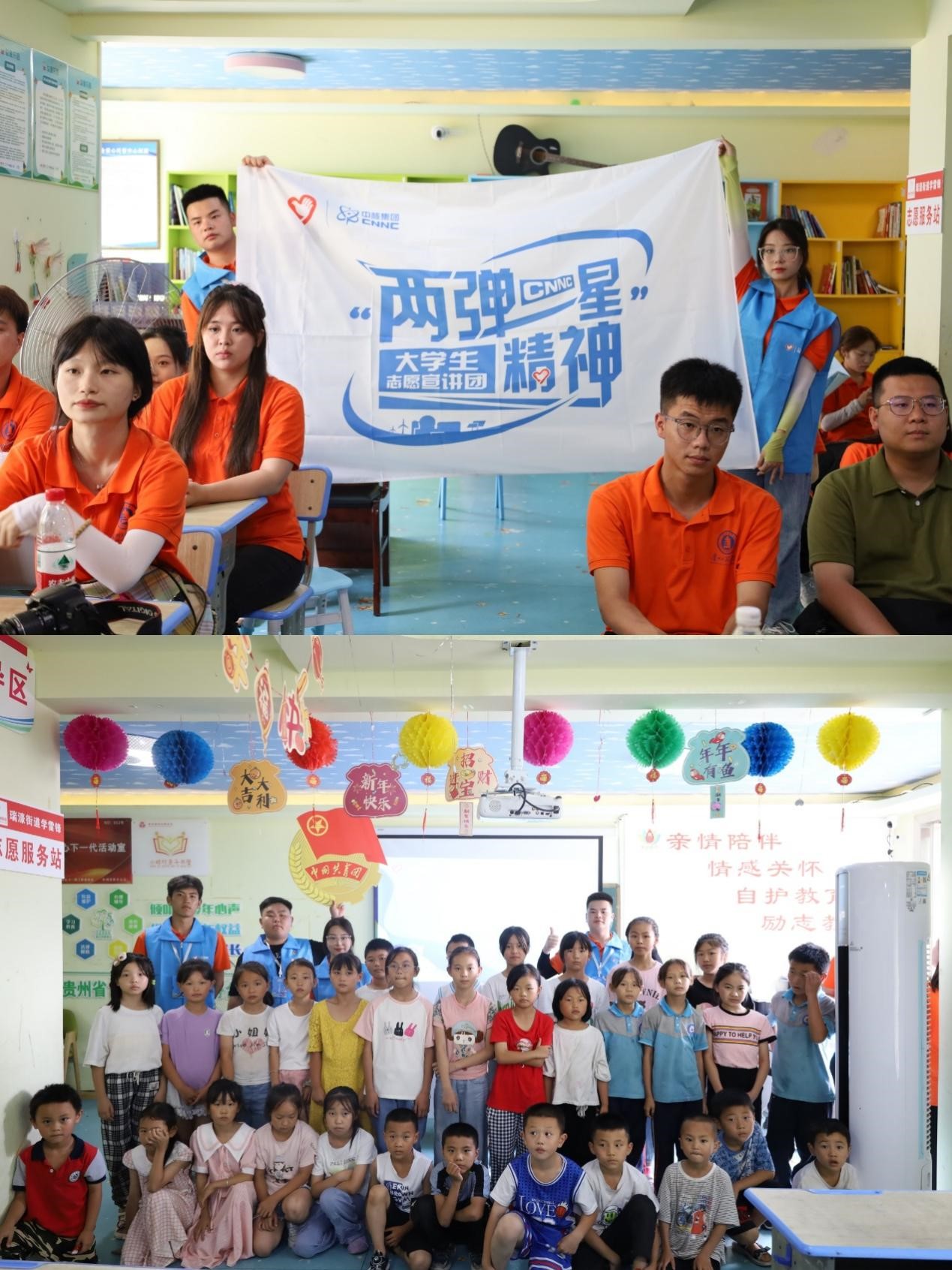 为深入学习宣传贯彻习近平新时代中国特色社会主义思想和党的二十大精神,落实“强国复兴有我”群众性主题宣传教育活动相关要求,引导动员广大青年学生弘扬“两弹一星”精神,77779193永利官网集团团委组织2023全国大学生“两弹一星”精神志愿宣讲团、省级优秀志愿服务组织——“炫美阳光”于2023年7月14日赴遵义市正安县瑞濠移民安置小区“希望小课堂”,围绕“五育并举”,立足专业特色和师范属性,将神奇的核科技、神圣的核事业、神秘的核工业,通过唱、跳、奏、演、绘的艺术形式进行宣讲与教学,以艺为媒,增强移民安置区儿童对“两弹一星”精神的理解,深刻感悟老一辈科学家崇高的理想信念和高尚的价值追求,引导党团青年在“学思用”贯通、“知信行”统一中感悟思想伟力、汲取奋进力量,践行“请党放心,强国有我”的青春誓言,奏响“清澈的爱只为中国”新时代青年最强音。