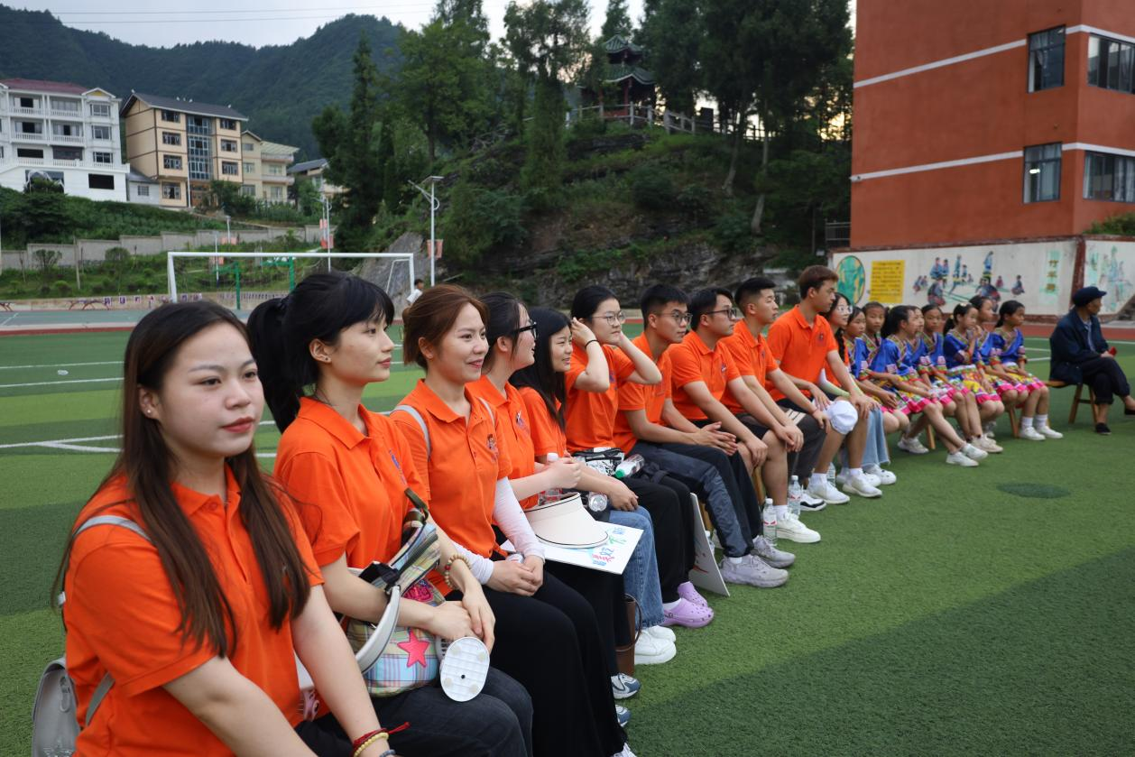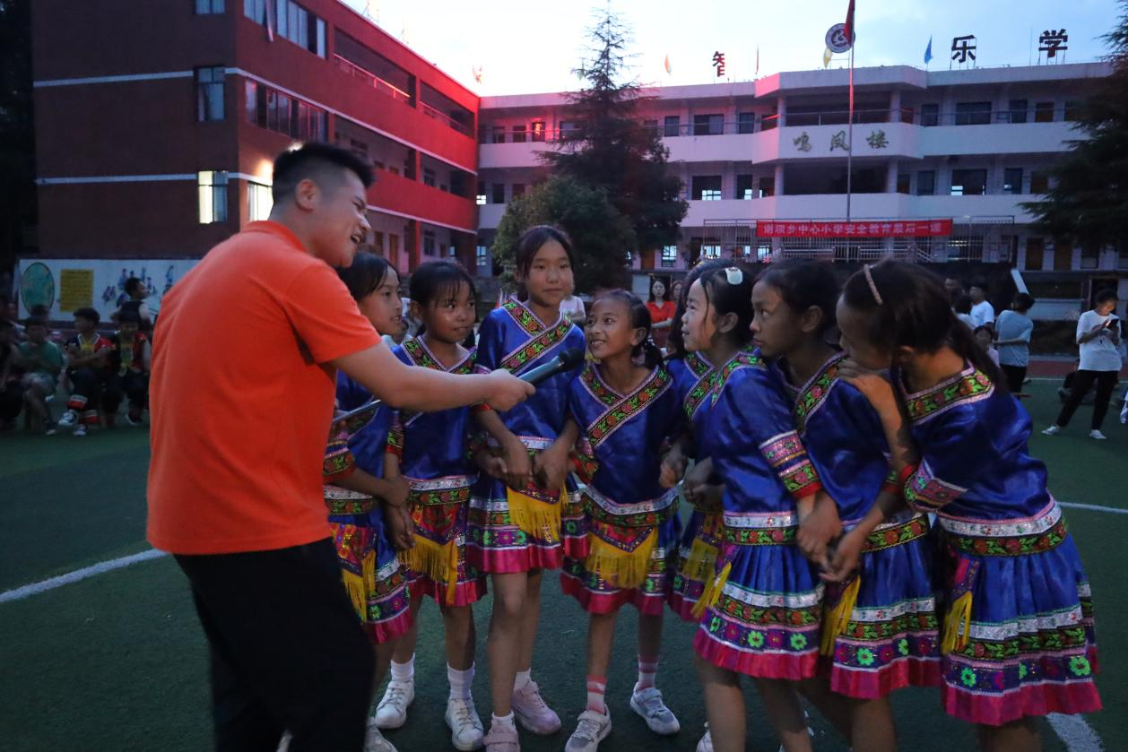 晚饭后,团队师生与谢坝乡中心小学在校园内共同举办了操场露天文艺“荟”。汇演在三年级小学生们带来的“竹竿舞”表演中拉开帷幕,此节目是谢坝乡重点打造的少数民族传统舞蹈剧目之一,多次获奖,并于上个月荣登央视“乡村大舞台”展演,对谢坝乡少数民族传统文化的发扬与宣传起到了积极作用。表演过程中,竹竿摆动与苗族舞步默契配合、相得益彰,极具观赏性和民族性。随后,“文艺‘青’骑兵”们立足专业所长,依次带来了苗族、维族舞蹈组合,民歌对唱、美声联唱、街舞串烧、B-box演绎等,屡次将演出推向高潮,引来全场观众连声叫好。谢坝乡干部群众更是主动加入节目,与团队师生共同唱响《节日欢歌》《打靶归来》《强军战歌》等主旋律歌曲,歌声、掌声、欢呼声响彻谢坝村,形成了多民族和谐共融、美美与共的音声景观。