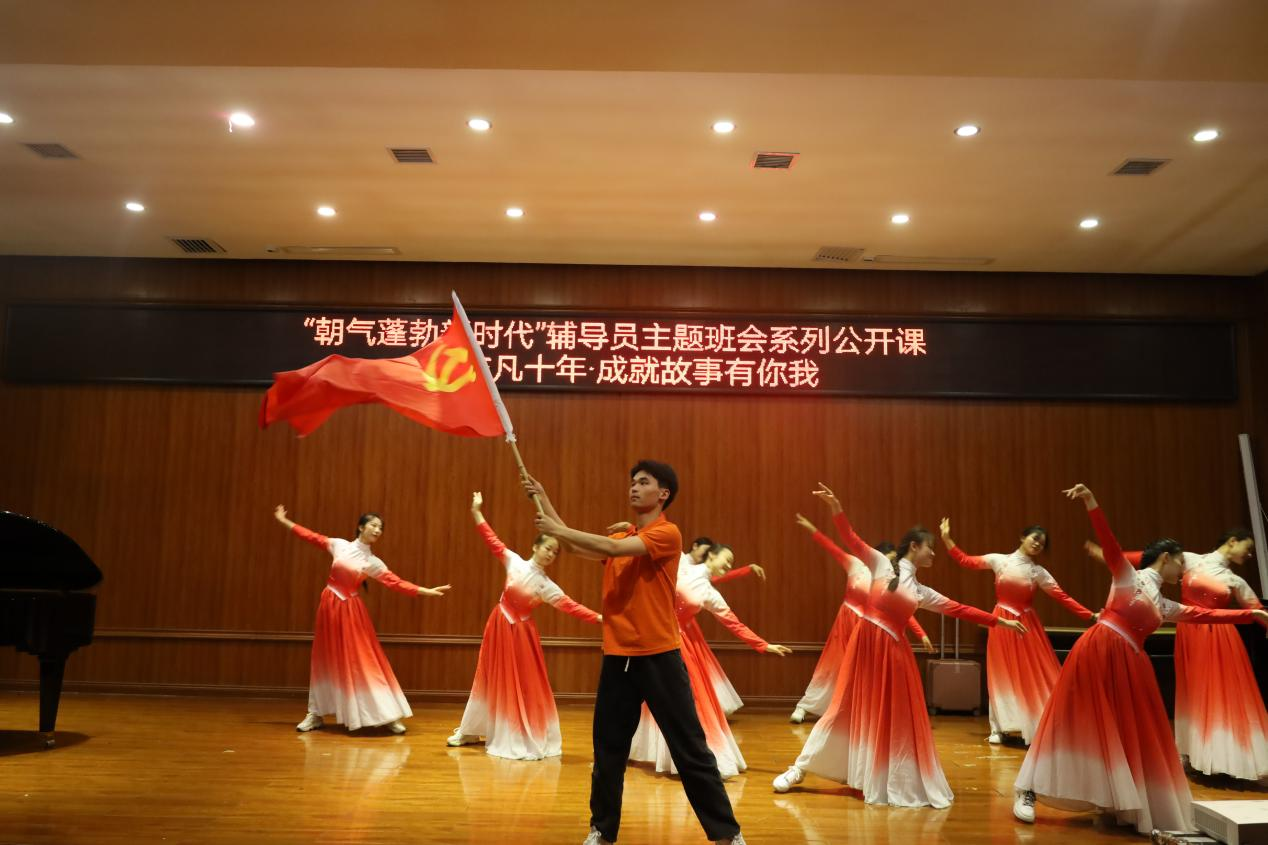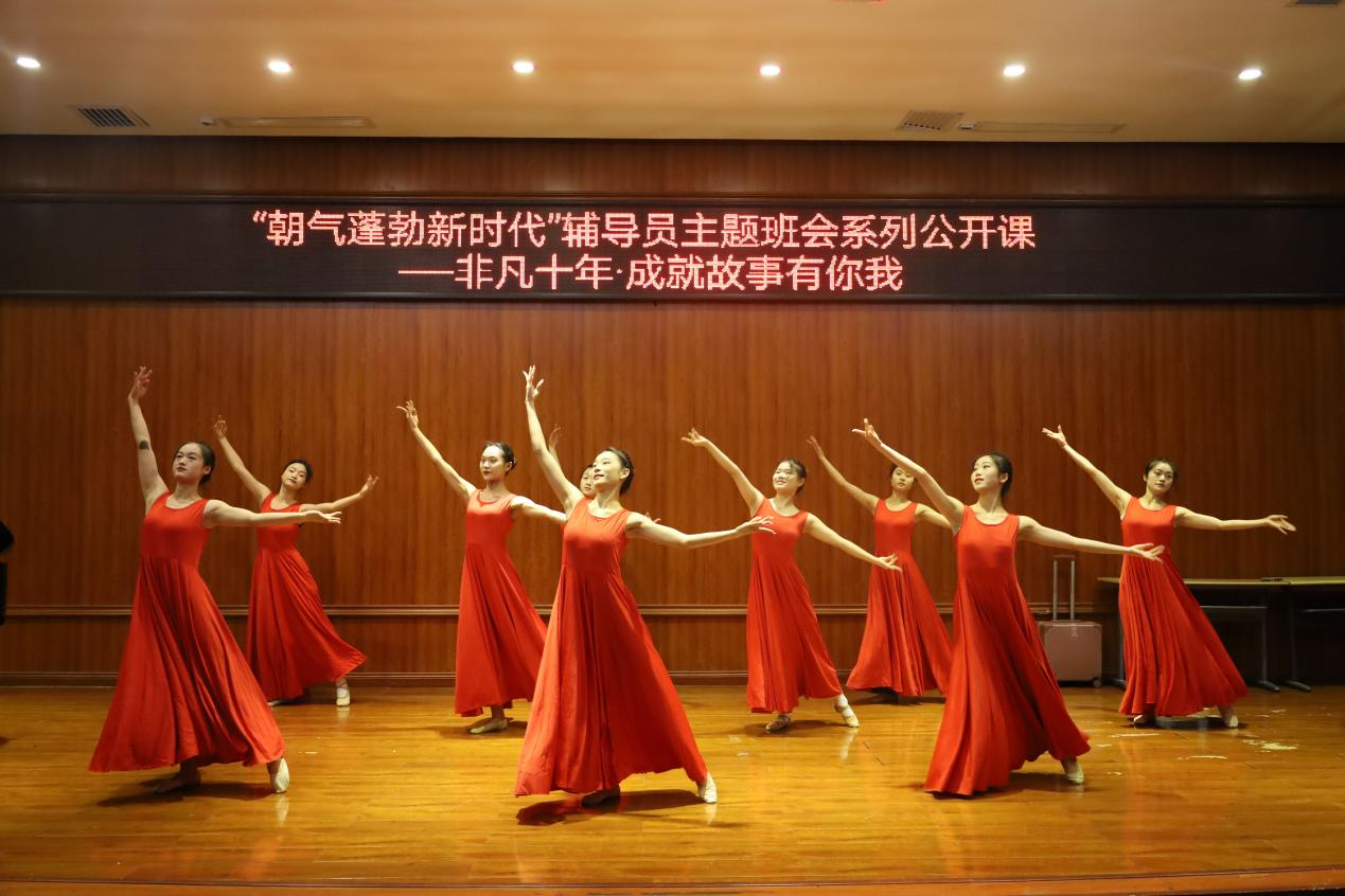 课程伊始,主持人欢迎了各特邀嘉宾到场观摩课程,然后正式进入上课环节。首先李金容老师对同学进行提问,从同学的回答之中引出课程主题,随后为同学们播放了贵州省黄金10年伟大变革视频,让同学们对贵州十年来的变化和发展有了基本了解。视频结束后用以黄文秀书记为榜样的话剧《乡村支教老师》开始了本场演出,在话剧之中加入了《党旗飘扬的方向》、《青春之歌》、《我们走在大路上》、《歌声与微笑》、《New boy》、《骄傲的少年》等舞蹈节目和《我的祖国》、《年轻的朋友来相会》、《我们都是追梦人》等音乐节目。在音乐和舞蹈的表演中激发出新时代大学生豪情壮志,凝聚大学生的拼搏力量,同时以歌舞的形式,讲好身边10年成就故事,引导学生领悟非凡十年里祖国强大的前进动力来源,以《一起向未来》、《美丽中国》两个舞蹈节目作为故事结尾,展现出高校学子昂扬的精神风貌,让同学们更加清晰的看到新中国的变化、新中国光辉的面貌。课程最后由李佩书记做班会总结:新时代青年应该不忘初心,牢记使命,坚持在发展的道路上,一步一个脚印踏实的走下去,为家乡的发展献出自己的一份力量。