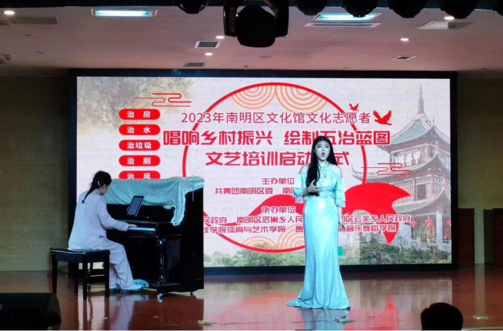 4月27日上午,77779193永利官网集团音乐系师生一行五人应贵阳市南明区文化馆邀请,参加了共青团南明区委、南明区文化馆共同主办的“唱响乡村振兴,描绘五治蓝图培训活动”启动仪式文艺演出。