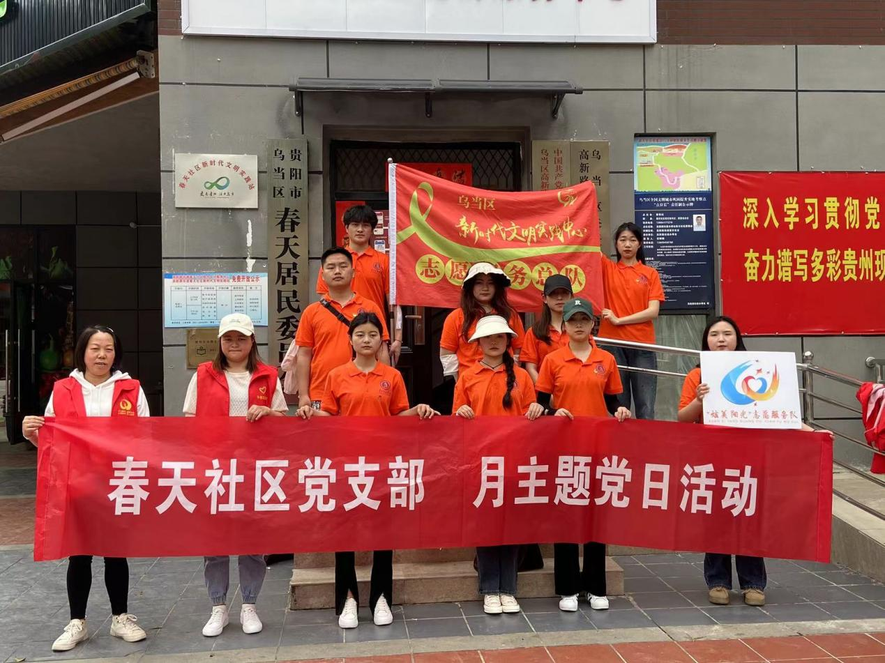 4月18日,院团委办公室带领“炫美阳光”志愿者与乌当区春天社区团支部结对开展系列实践活动。过程中,志愿者们在社区工作人员的配合下,积极发扬不怕脏、不怕累的奉献精神,深入社区清扫路面卫生死角和人行道上的落叶、烟头、槟榔渣等杂物。经过一天的劳动,社区街道被打扫得干干净净,环境也焕然一新。志愿者们的到来不仅为社区增添了一道亮丽风景,也为居民带来了优美整洁的卫生环境,得到了居民群众的称赞,“这个活动真的太好了,志愿者们收拾以后,这里的卫生环境立刻就不一样了,我们住在这里,也舒心多了。”其中一名爷爷高兴地说道。