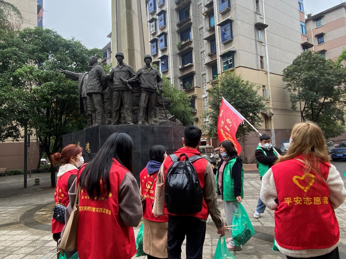 首先,胡欣、何小芬带领党团青年参观了“振华魂”雕像,生动讲述了热血青年构筑“振华魂”的感人故事,同学们纷纷为干惊天动地事,做隐姓埋名人的振华精神所感动,立志也要将汗水挥洒在平凡的事业中,把青春践行在志愿服务的大地上。随后,同学们分小组,依次开展了党的二十大知识社区调研、慰问五老、开展环保劳动教育等实践活动。学生党员通过社区一对一走访调研,生成调查报告,拟定二十大宣讲方案;团学青年以身作则,一边清理和分拣社区垃圾,一边开展环保宣传、垃圾分类知识普及工作;“炫美阳光”志愿者则在社区工作人员带领下对辖区内的五老群体进行慰问,践行爱老敬老精神,弘扬中华优秀传统美德。最后,历时一天的活动在同学们与社区民众合唱《我和我的祖国》歌声中圆满结束。