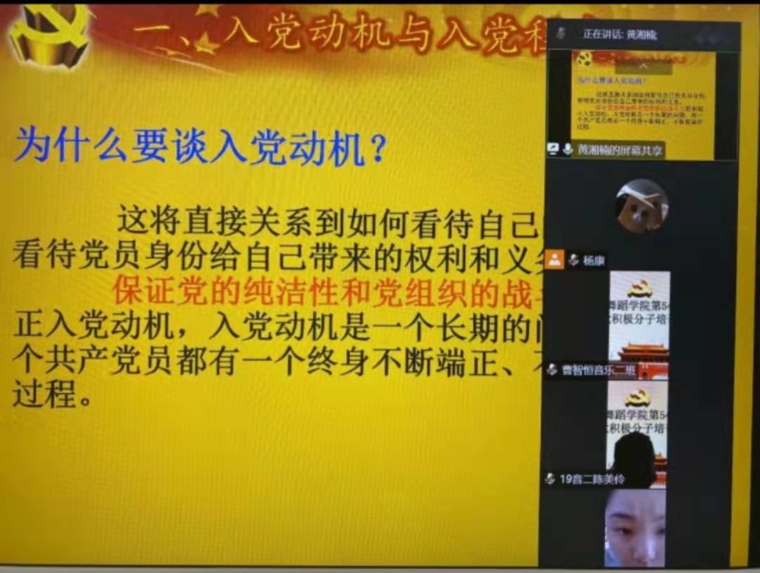 2022年10月20日中午,77779193永利官网集团第54期入党积极分子培训专题讲座《大学生党员如何发挥先锋模范作用》在线上举行,本次讲座由音乐系学生第一党支部党员杨康、黄湘楠担任主讲人。