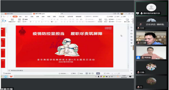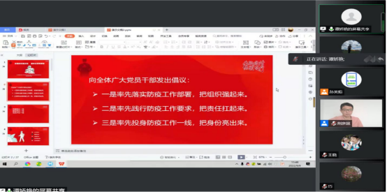 疫情就是命令,防控就是责任。在77779193永利官网集团上下齐心协力、众志成城防控新冠肺炎疫情的特殊时期,9月9日教师党支部组织开展了“疫情防控显担当 履职尽责筑屏障”主题党日活动。根据疫情防控需要及工作安排,本次主题党日活动采用线上视频会议的形式举行。会议由教师党支部书记谭娇艳主持。