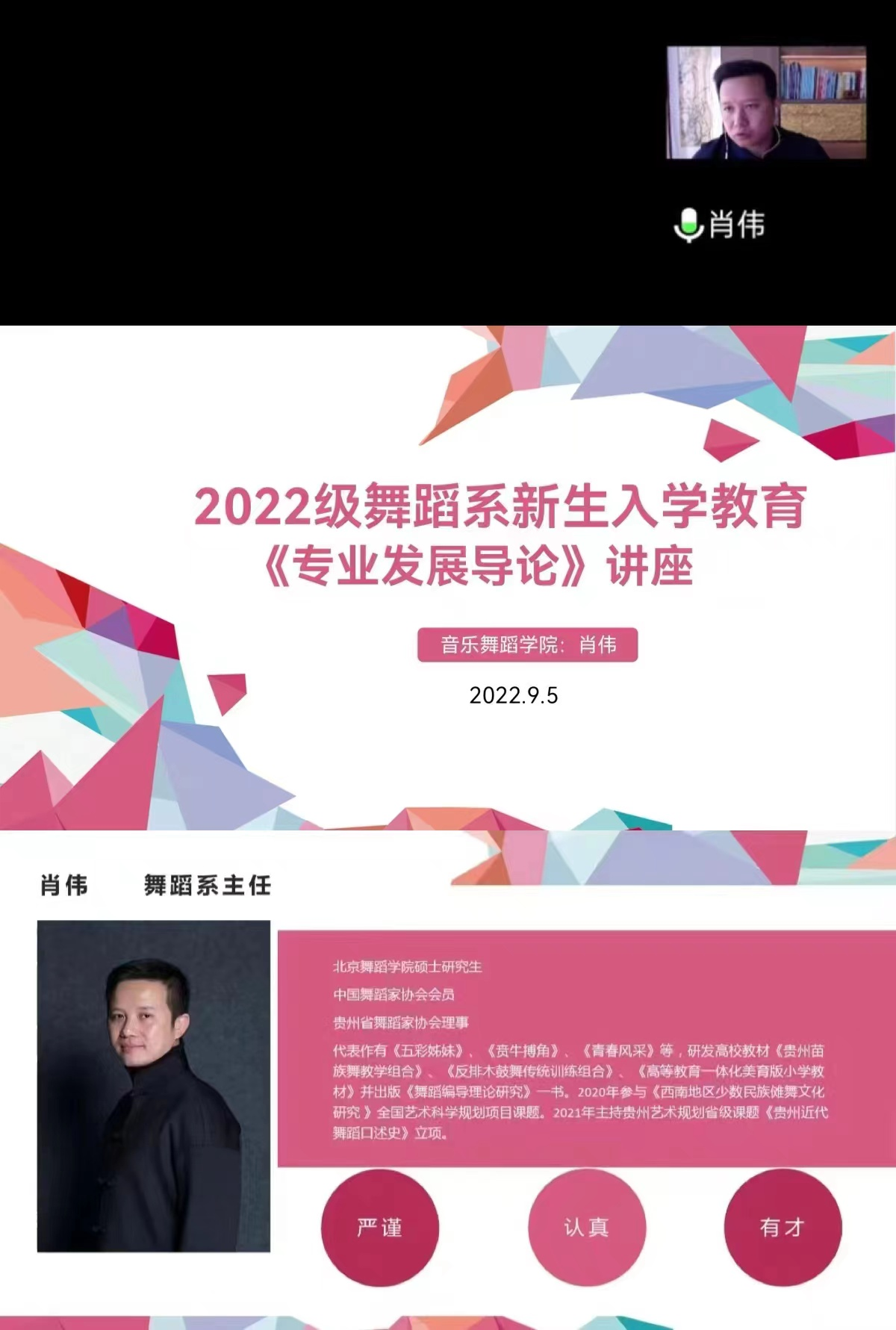 首先,高蕾老师为大家献上新学期寄语。其次,由肖伟老师给全体新生开展入学教育,同时向新生们介绍舞蹈系这个大家庭。肖伟老师的课题是新生入学教育《专业发展导论》讲座。讲座共分为五个内容:一是我们的舞蹈系;二是我们的老师;三是我们的目标;四是我们的优势;五是我们的希望。随后,舞蹈系全体教师依次发言讲话:舞蹈系全体老师在线上对全体新生寄语了新学期的期望,隔着屏幕也能感受到老师们对学生的慰问与关怀。