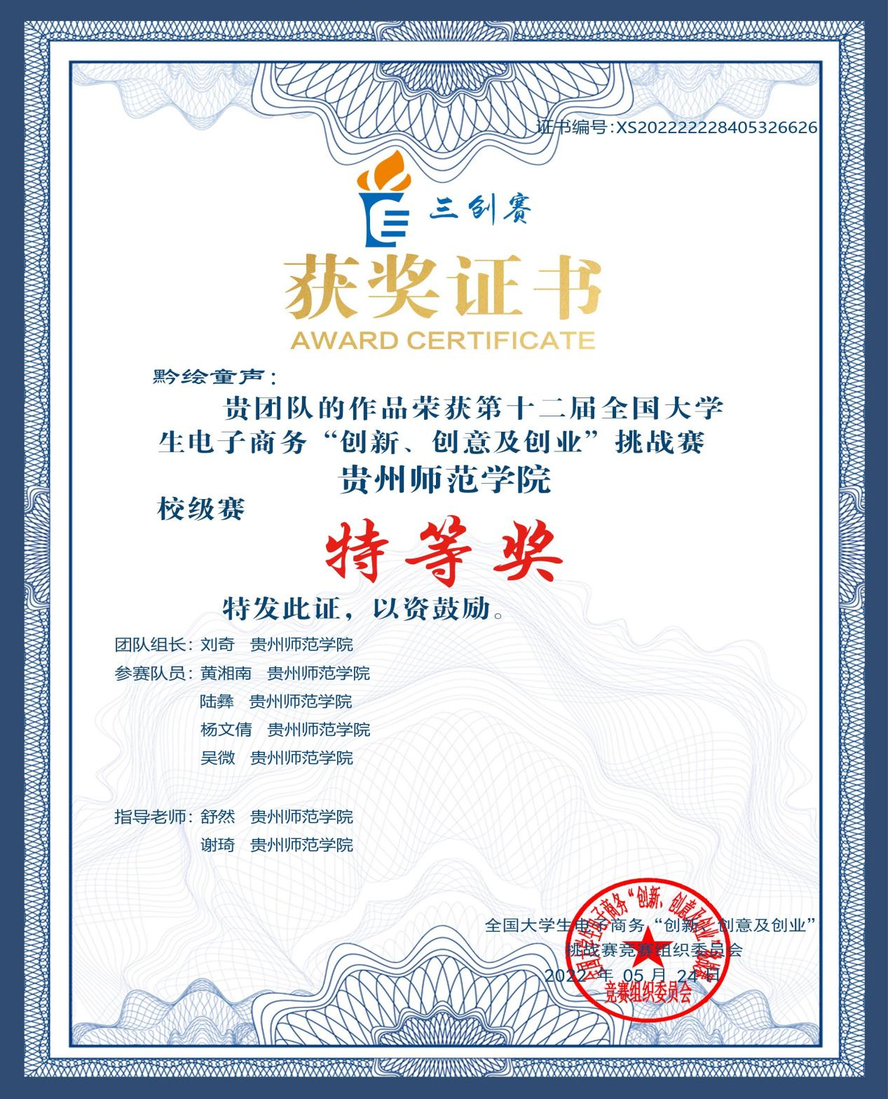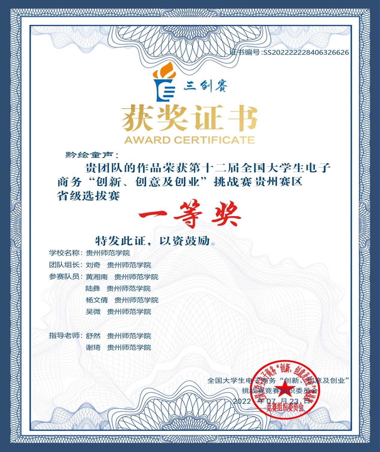 2022年6月12日,第十二届全国大学生电子商务“创新、创意及创业”挑战赛贵州赛区省级选拔赛在贵阳人文科技学院举行。经过2天激烈的角逐,最终,我院“黔绘童声”项目斩获一等奖。