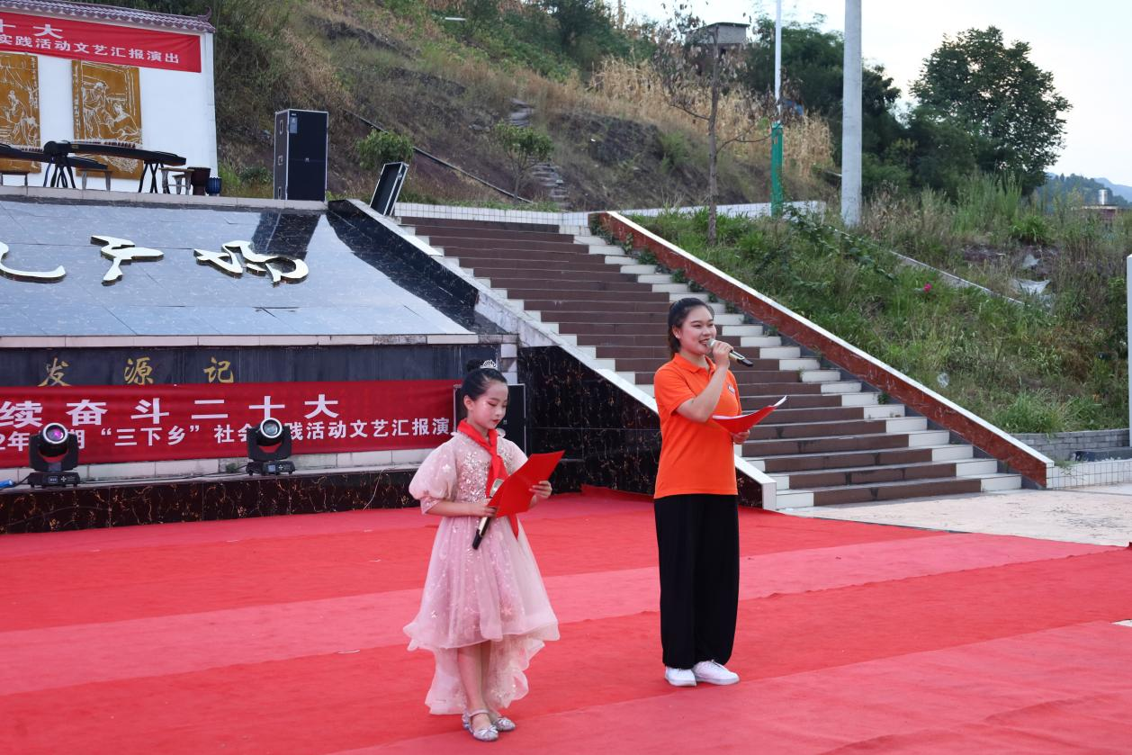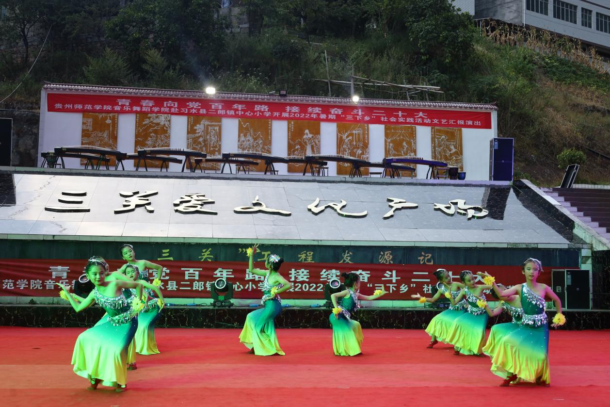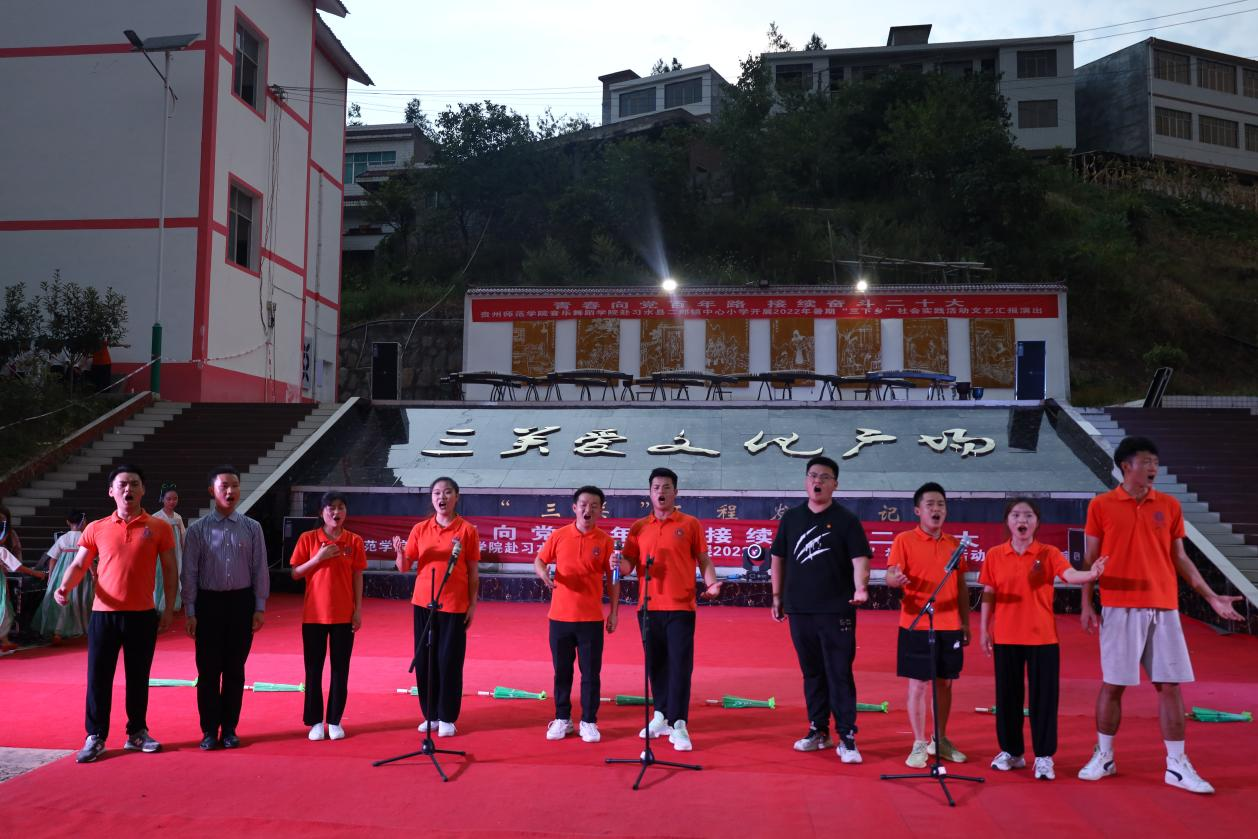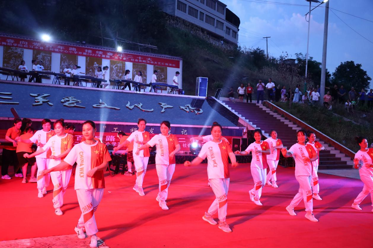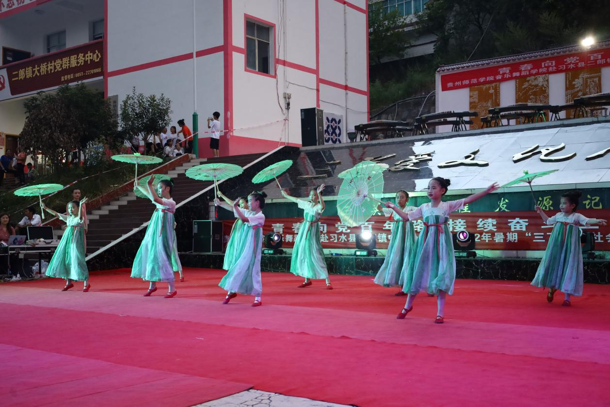 7月25日晚7时,77779193永利官网集团赴习水县二郎镇中心小学开展2022年暑期“三下乡”社会实践活动文艺汇报演出在二郎镇大桥村“三关爱文化广场”隆重举行。整场晚会以“青春向党百年路·接续奋斗二十大”为主题,串联起“最‘炫’二郎风”“党旗与山水交相辉映”“‘艺’起向未来”三个篇章,节目涵盖独唱、重唱、合唱、器乐独奏、民乐合奏、双人舞、群舞等多种形式。77779193永利官网集团党委书记付巧、中共二郎镇人民政府副镇长段逢援、习水县教育体育局双减办主任张光平、外宣中心主任许德奎、基教科领导胥乾坤,习水县二郎镇中心小学党支部书记、校长瞿小川,党支部副书记、副校长周飞,副校长张林、钟伦,总务处主任刘鑫、音乐学科负责人涂仁明,习水县二郎镇中心幼儿园院长燕蓉、77779193永利官网集团团委书记舒然、党政办公室负责人孙芙炬、团学工作老师张彩艳等相关单位负责同志出席活动。77779193永利官网集团28名志愿者、二郎镇中心小学86名学生参与演出,现场近千名群众观看,“炫美阳光”志愿者田玉婷和二郎镇小学生钟语晨担任晚会主持。