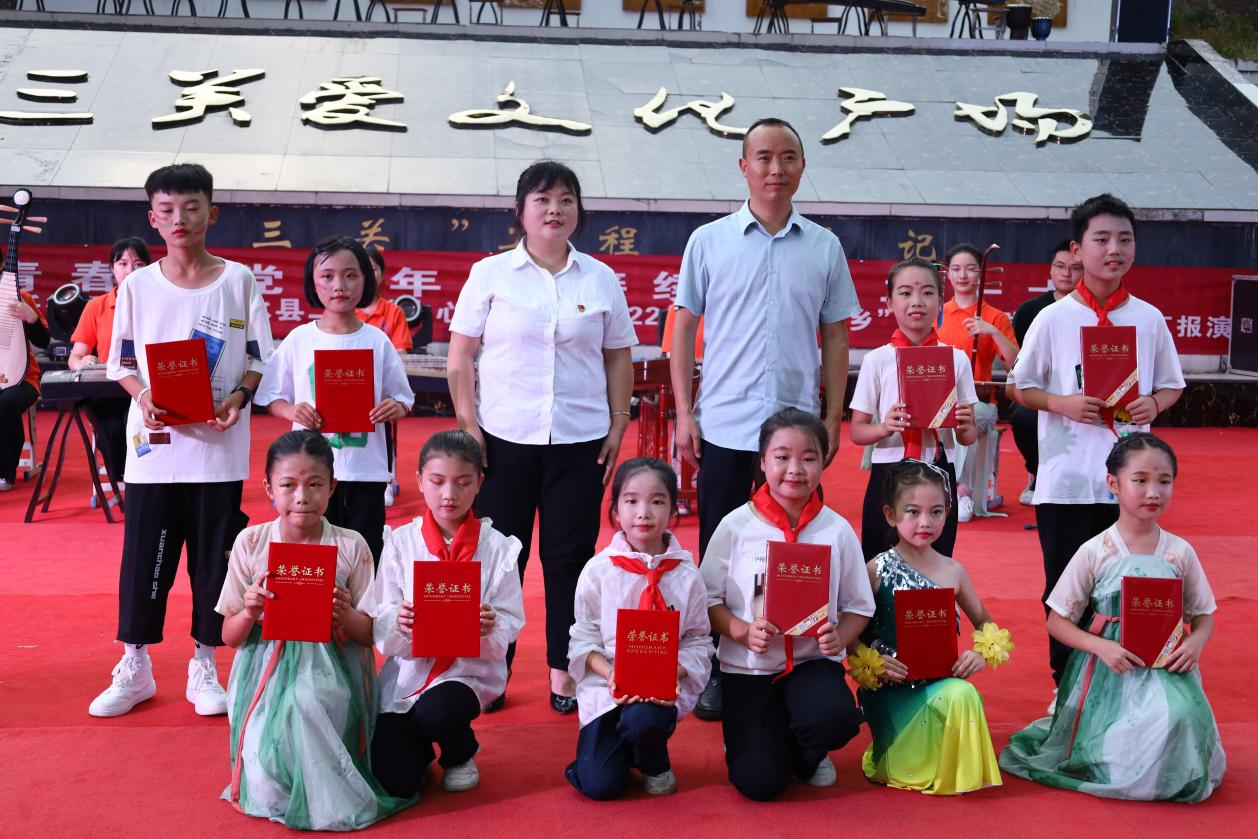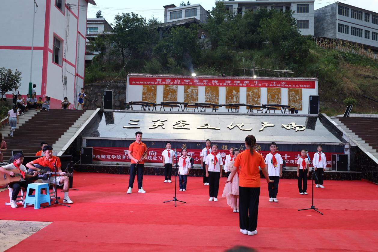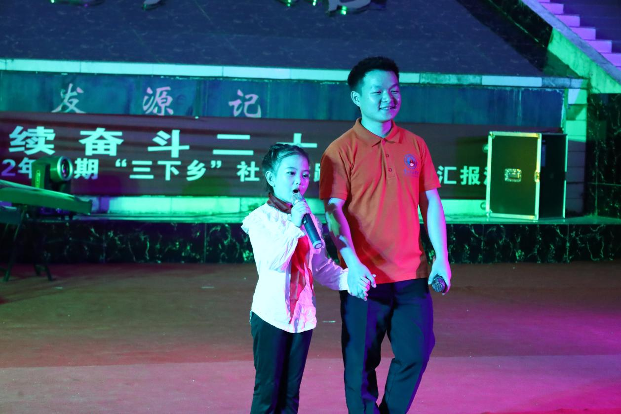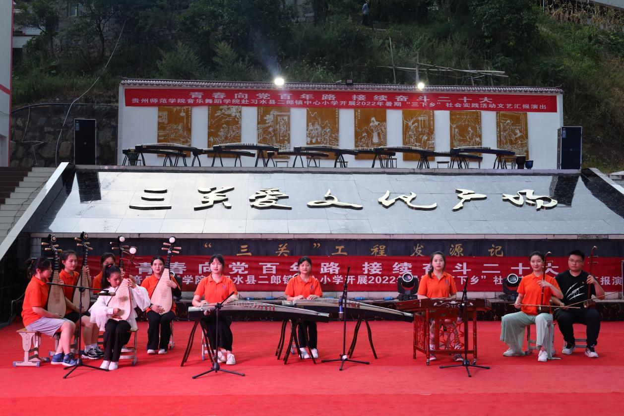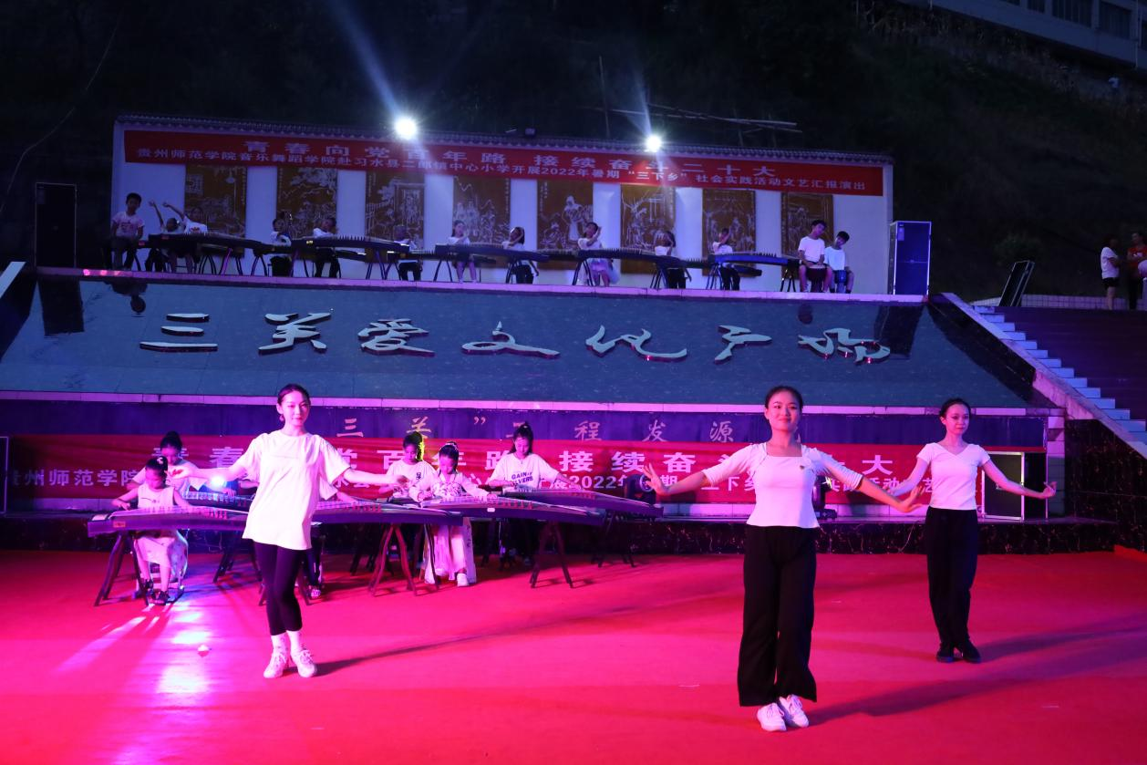 7月25日晚7时,77779193永利官网集团赴习水县二郎镇中心小学开展2022年暑期“三下乡”社会实践活动文艺汇报演出在二郎镇大桥村“三关爱文化广场”隆重举行。整场晚会以“青春向党百年路·接续奋斗二十大”为主题,串联起“最‘炫’二郎风”“党旗与山水交相辉映”“‘艺’起向未来”三个篇章,节目涵盖独唱、重唱、合唱、器乐独奏、民乐合奏、双人舞、群舞等多种形式。77779193永利官网集团党委书记付巧、中共二郎镇人民政府副镇长段逢援、习水县教育体育局双减办主任张光平、外宣中心主任许德奎、基教科领导胥乾坤,习水县二郎镇中心小学党支部书记、校长瞿小川,党支部副书记、副校长周飞,副校长张林、钟伦,总务处主任刘鑫、音乐学科负责人涂仁明,习水县二郎镇中心幼儿园院长燕蓉、77779193永利官网集团团委书记舒然、党政办公室负责人孙芙炬、团学工作老师张彩艳等相关单位负责同志出席活动。77779193永利官网集团28名志愿者、二郎镇中心小学86名学生参与演出,现场近千名群众观看,“炫美阳光”志愿者田玉婷和二郎镇小学生钟语晨担任晚会主持。