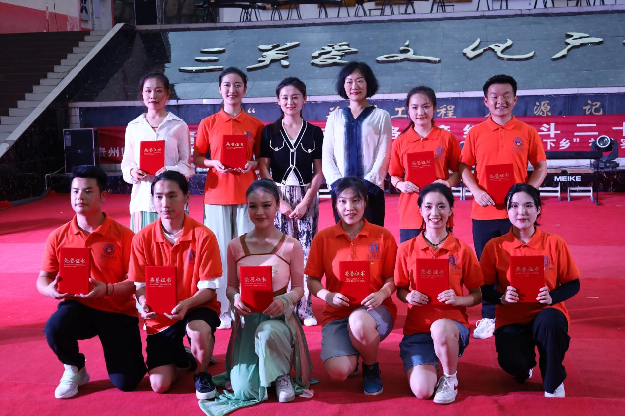 第二篇章在由古筝、琵琶、二胡、扬琴组成的民乐合奏《映山红》中激动启程,学习琵琶不到十天的小学生丁欣悦担任领奏,演员们沉着稳定、妙态绝伦的表现艳惊四座。“我和我的祖国,一刻也不能分割”“你用甘甜的乳汁,哺育各族儿女”“我爱你中国”“党的光辉照我心”......一首首耳熟能详的红色旋律唱响时,全体演员与在场观众开启了“大合唱”模式,共同演绎出了“鎏金歌声敬红城”的感激之情、昂扬之感,大家沉浸其中,沐浴着党和国家的温暖,感恩着这份来之不易的幸福生活。接下来,一群手持折伞的孩子随着《杏花雨纷纷》音乐的响起,缓缓移步舞台,一张张笑容荡漾的面庞,随着轻盈的舞步旋转,飘逸的裙摆如阵阵绿风、绿烟、绿雾,在绿洲红城上起舞、律动、闪耀!第二篇章结束后,付巧、舒然为志愿者代表颁发了“优秀志愿者”荣誉证书。文艺支教,不仅给山里的孩子播下了“艺术之星”的种子,也让“炫美阳光”的每一位志愿者在历练中成长,在成长中成才!