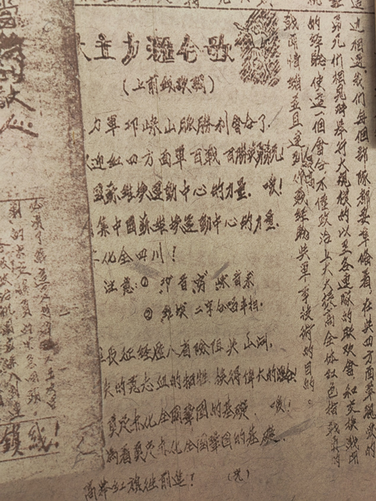 在二郎滩的调研中,理论教研室主任舒然和教师孙芙炬,首先以文献收集为主线,收集了地戏面具及唱本若干、民间仪式唱本若干,在资料收集过程中,意外发现民间艺人收集的中国第二次国内革命战争时期中国工农红军军事委员会机关报——《红星报》上,有一首《大主力汇合歌》,并标注了演唱提示,激发了在座老师的研究兴趣。