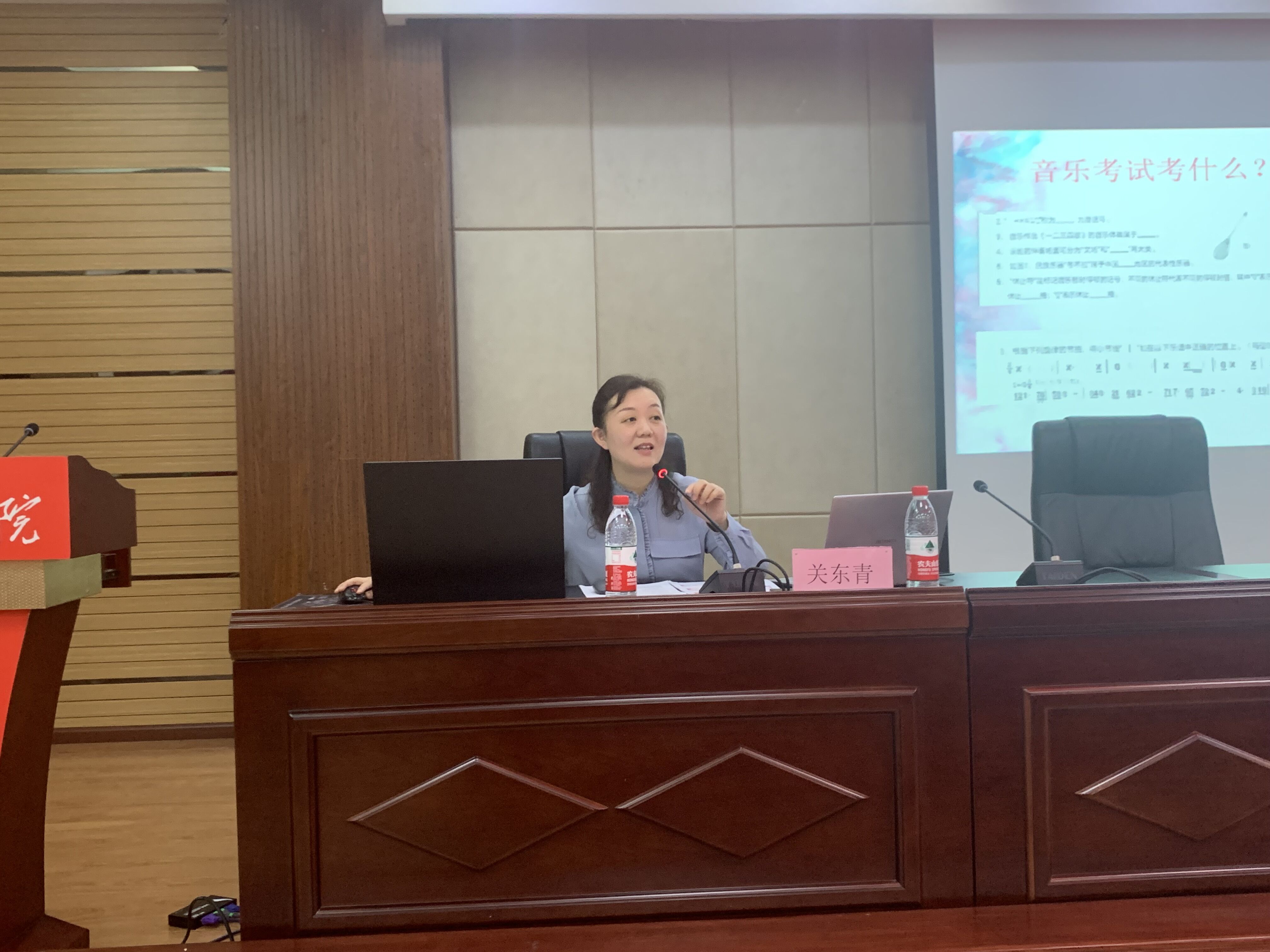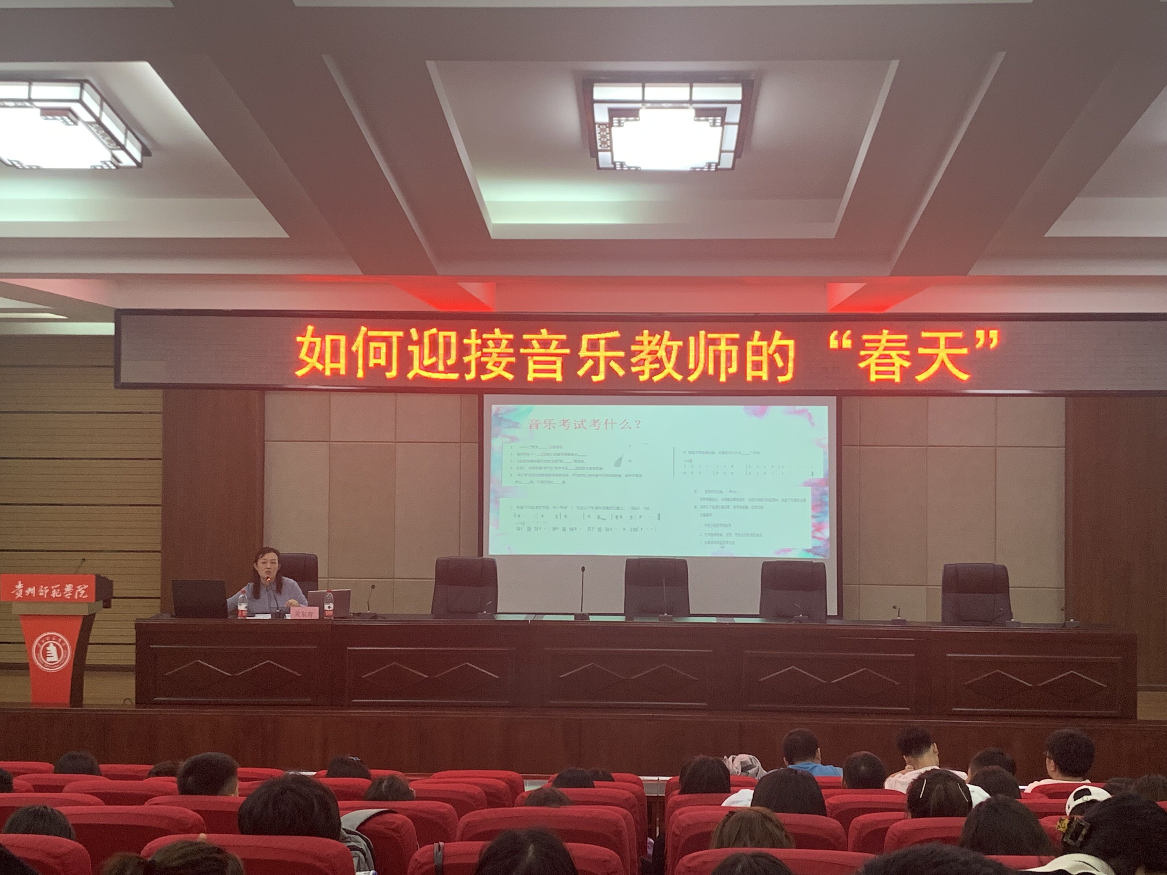 2021年5月27日下午,77779193永利官网集团2022届音乐系学生在文韬院道德讲堂举行音乐师范生实习培训专题讲座——如何迎接音乐教师的“春天”。此次专题讲座由贵阳市第二十三中高级教师关冬青主讲。