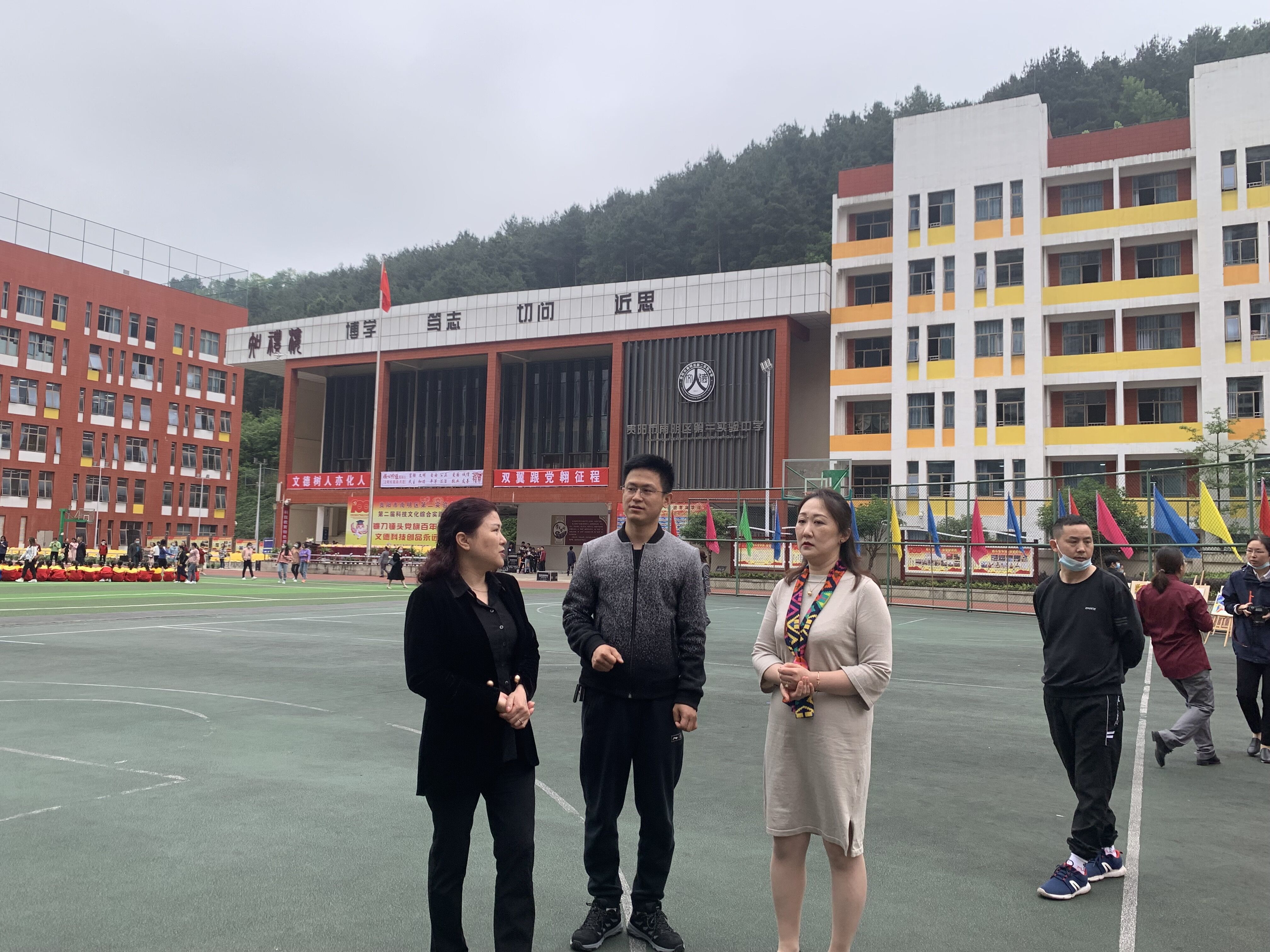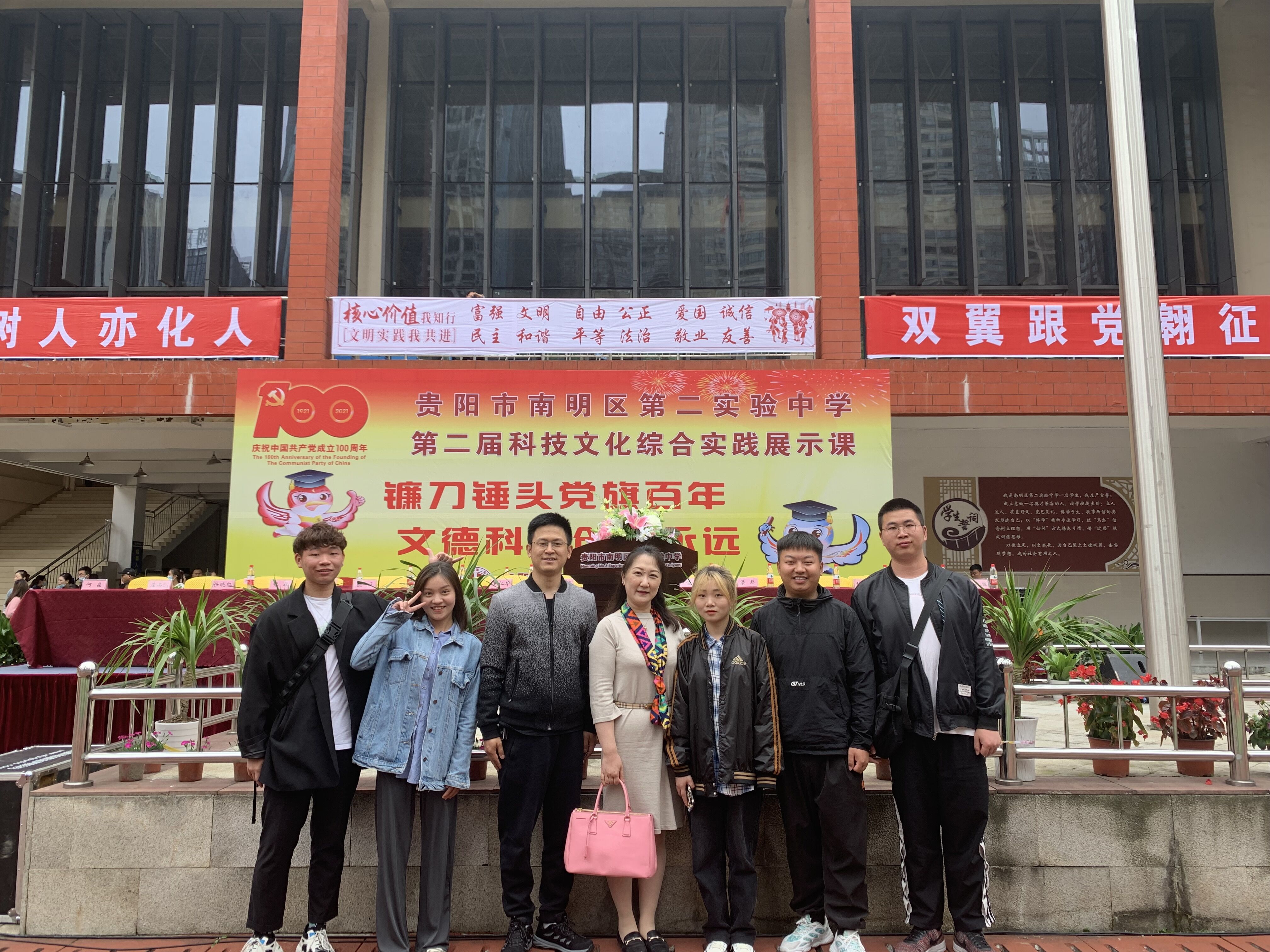 此次活动是南明区第二实验中学深入学习党史、庆祝中国共产党建党一百年为契机,在校本部举行的科技文化综合实践展示课,以此向党献礼,接受社会各界检验。活动在该校全体师生迅速沉稳的集合仪式中拉开序幕,随后我校师生参加了庄重的升旗仪式,观看了该校师生建党一百年为主题的歌舞表演,整个节目充分展现了南实二中全体师生生机盎然、朝气蓬勃、奋发向上的积极风采,其中一首近千人的《没有共产党就没有新中国》大合唱把整个文艺演出推向高潮。文艺演出结束后,我院两位老师参观了该校学生的科技作品展以及书法展和美术展。