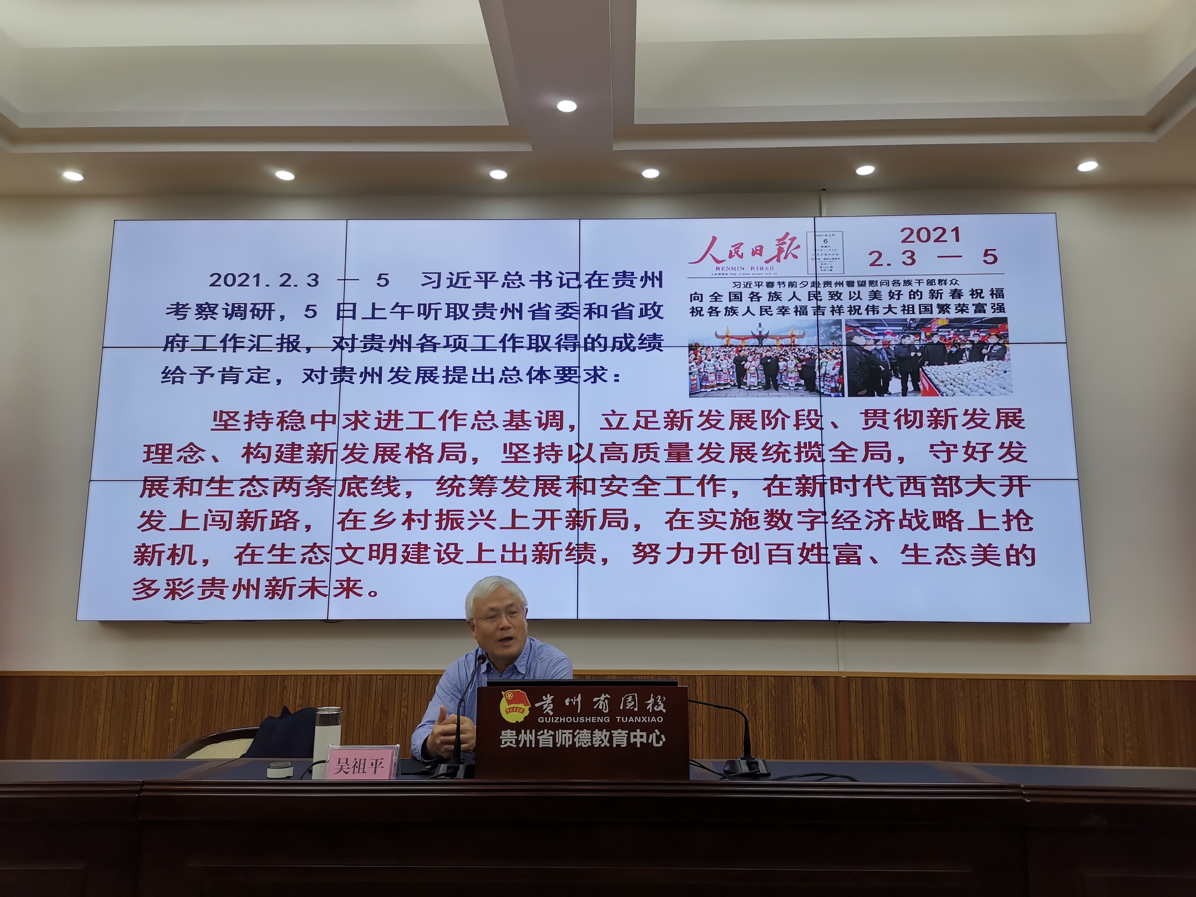 上午8时,省团校请到了贵州省委政策研究室原副主任吴祖平老师进行讲学“学习习近平总书记对贵州系列重要讲话精神。”坚持以高质量发展统揽全局努力开创百姓富、生态美的多彩贵州新未来。吴老师从三个点给我们进行给我们分析了2021年2月3日——2月5日春节前夕习近平总书记在贵州考察调研时对贵州各项工作取得的成绩给予肯定并对贵州的发展提出了要求。