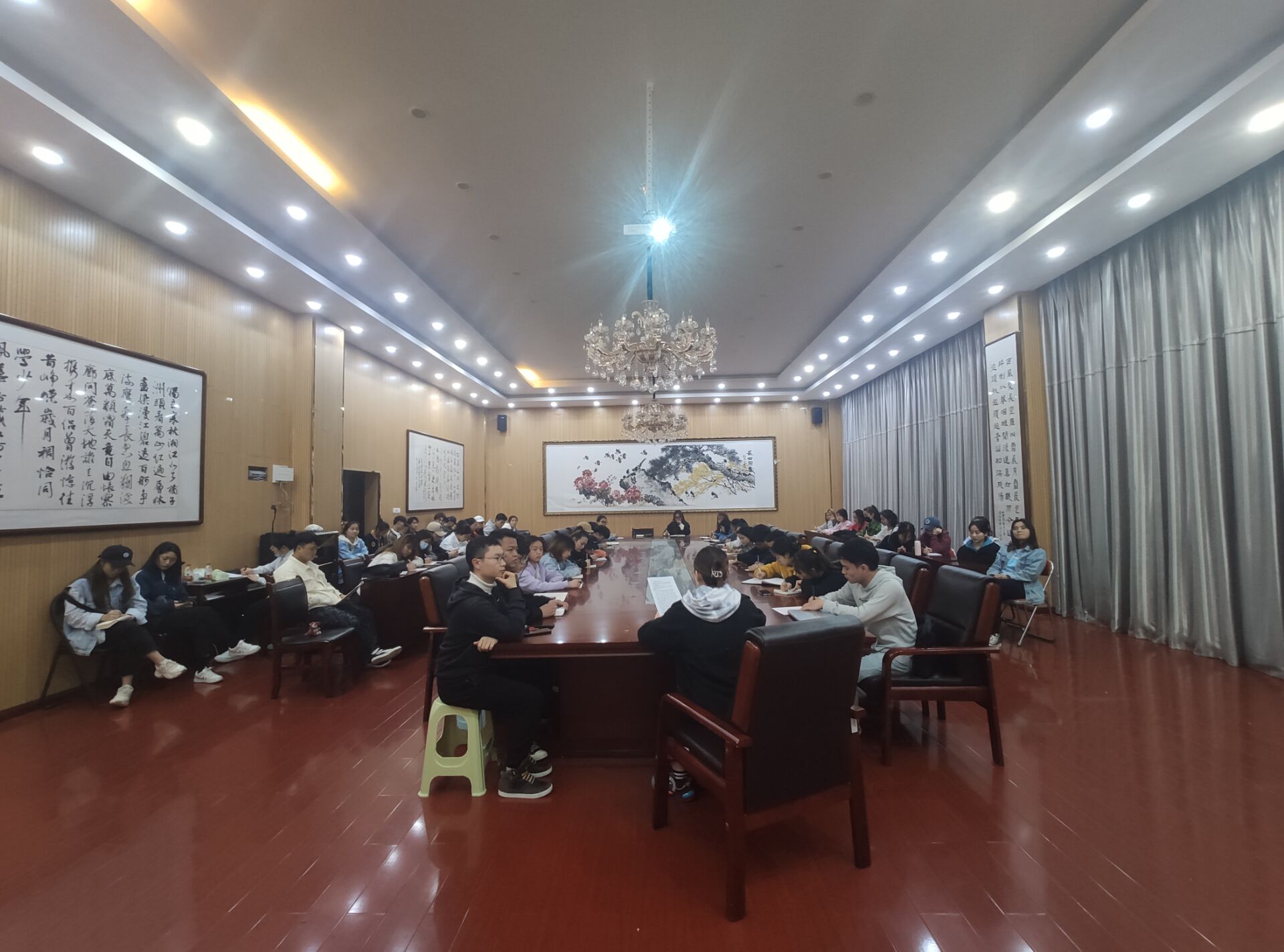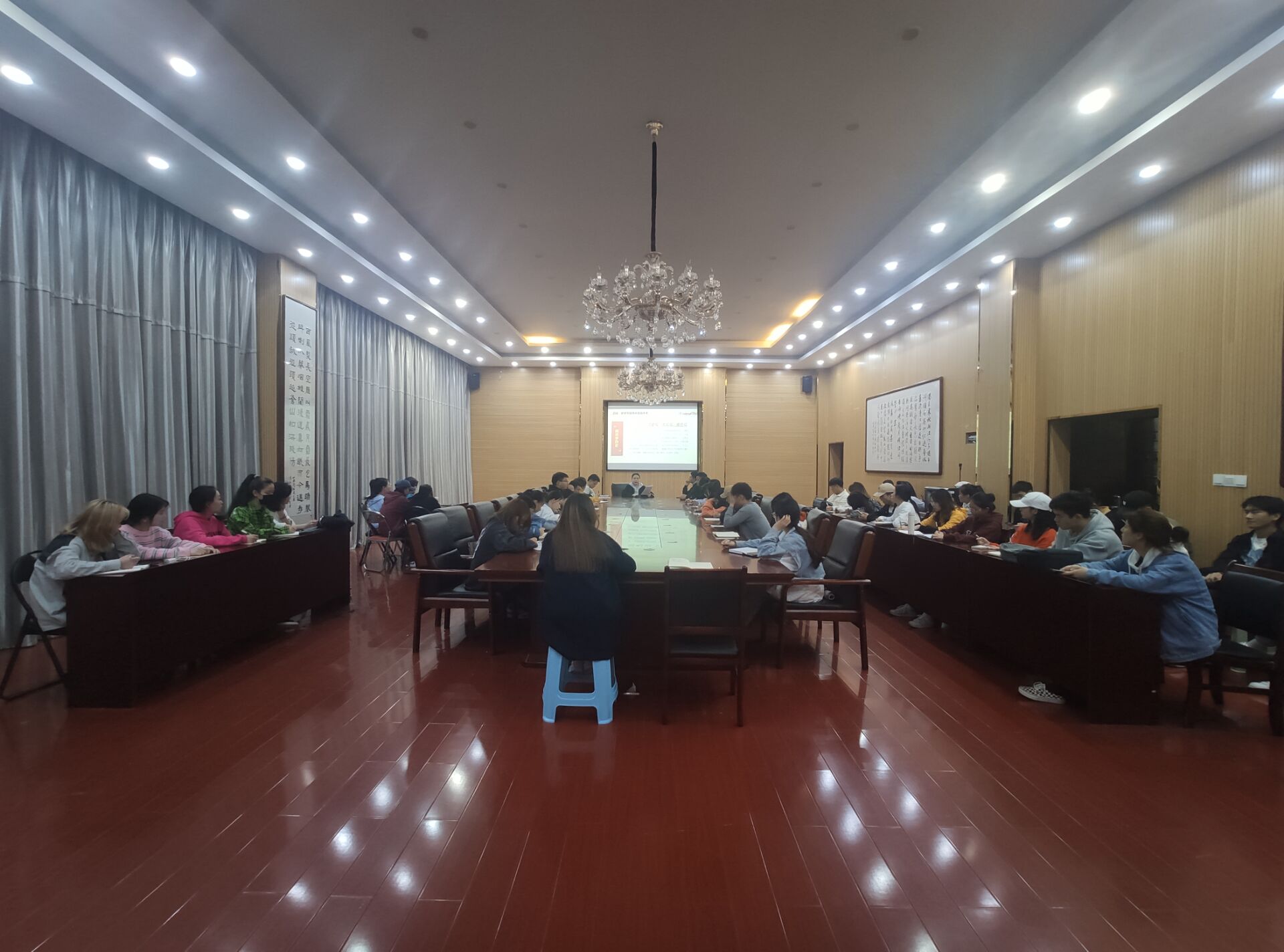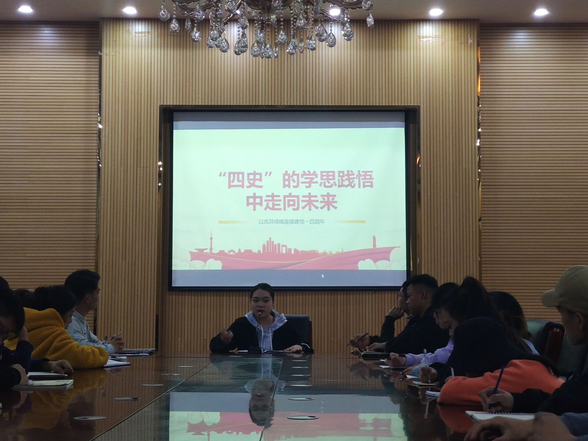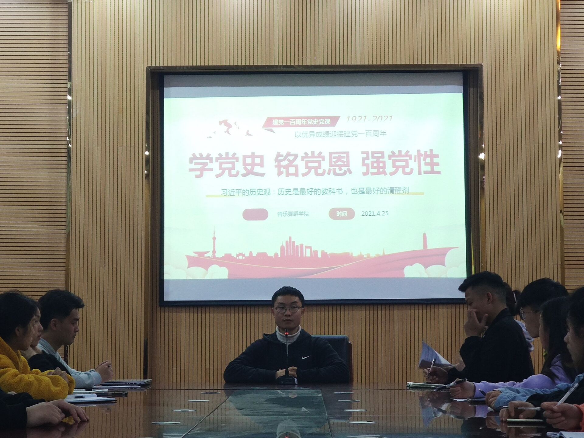 4月26日晚,77779193永利官网集团组织全体学生干部在六楼会议室进行学党史、铭党恩、强党性主题教育。本次主题教育活动由学院教师涂仁明主持。