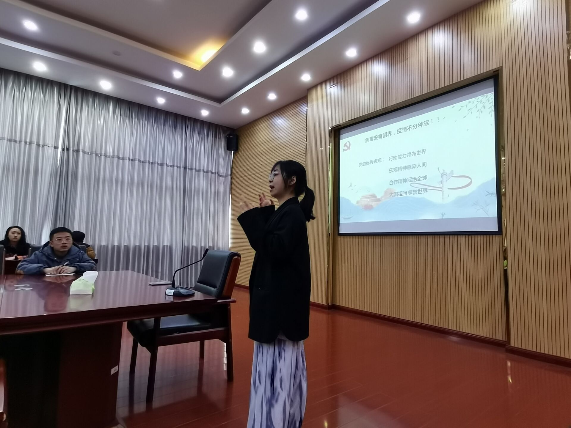 首先,陈璐带领大家回顾到了疫情刚开始爆发的时候,讲述了当时疫情的严重性,通过列举了疫情期间的种种事迹与学员们展开了论述和探讨,通过大家的讲述进行补充及总结,强调了在疫情防控一线,广大党员充分发挥先锋模范作用,切实做到“疫情在哪里,党员就战斗在哪里;哪里有困难,哪里就有党员站在一线”,让学员们懂得了“岁月静好,其实是有人为我们负重前行”,正是因为有了疫情防控第一线时刻飘扬的一面面鲜艳党旗,才有我们现在能安安心心在教室上课。