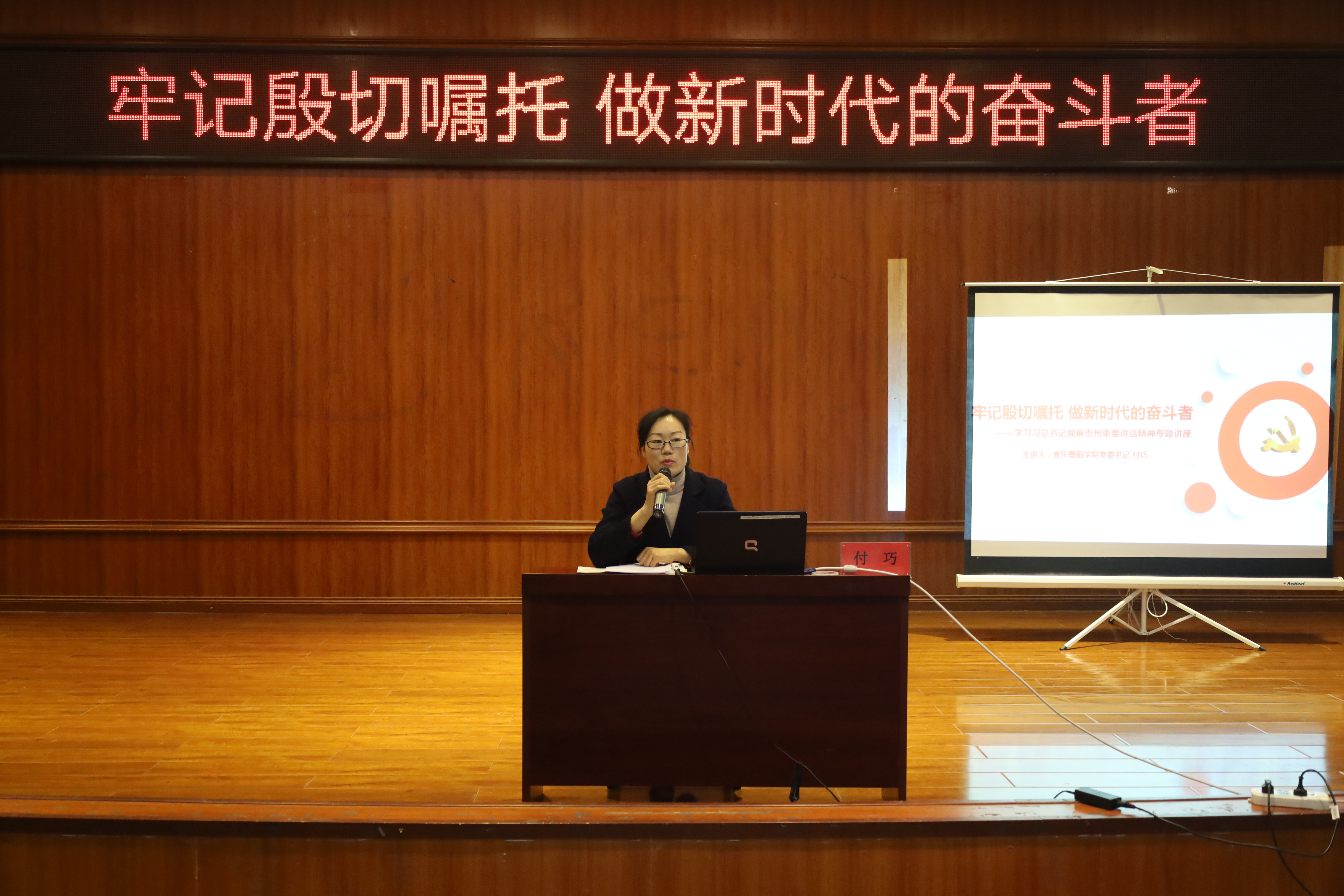 3月4日,77779193永利官网集团在逸夫楼六楼音乐厅开展学习贯彻习近平总书记视察贵州重要讲话精神专题宣讲,宣讲的主题是“牢记殷切嘱托,做新时代的奋斗者”,77779193永利官网集团党委书记付巧主讲,学院全体学生党员、入党积极分子、学生干部、团员代表及学生代表参加了学习。