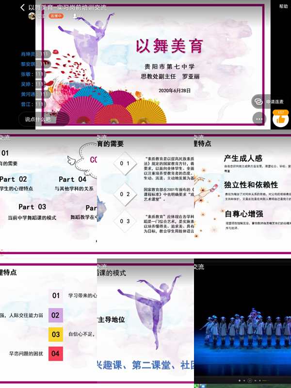 2020年6月28日,贵阳市第七中学思教处副主任罗亚丽受邀为我院即将实习的2017级舞蹈系学生举办实习岗前培训讲座,本次讲座利用互联网平台,采取线上直播的形式的进行。