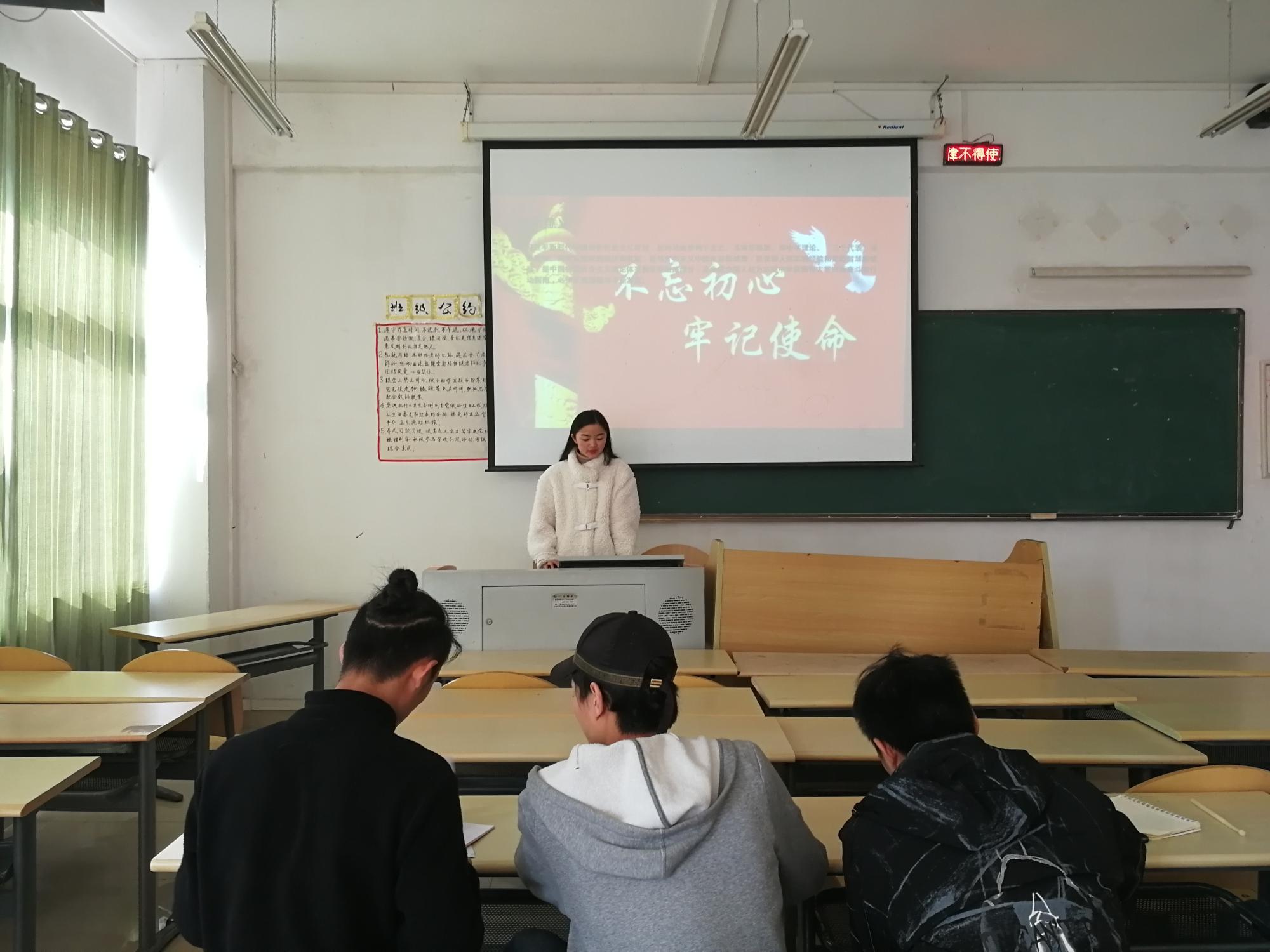 学生党员罗鑫瑶带领大家学习了习近平新时代中国特色社会主义思想、《习近平“不忘初心、牢记使命”论述摘编》、《中国共产党章程》、《中国共产党支部工作条例(试行)》、《中国共产党党员教育管理工作条例》等重要法规。