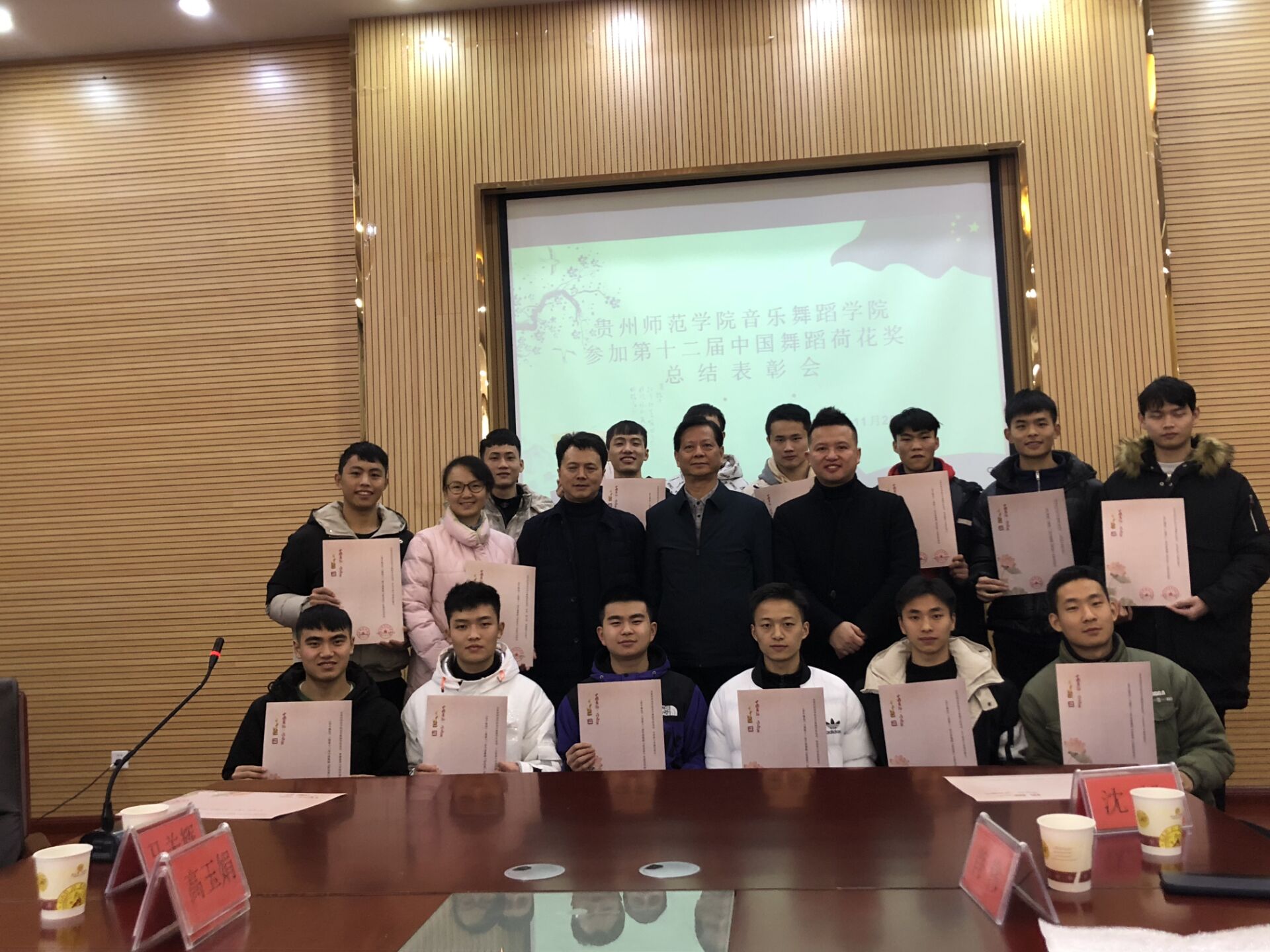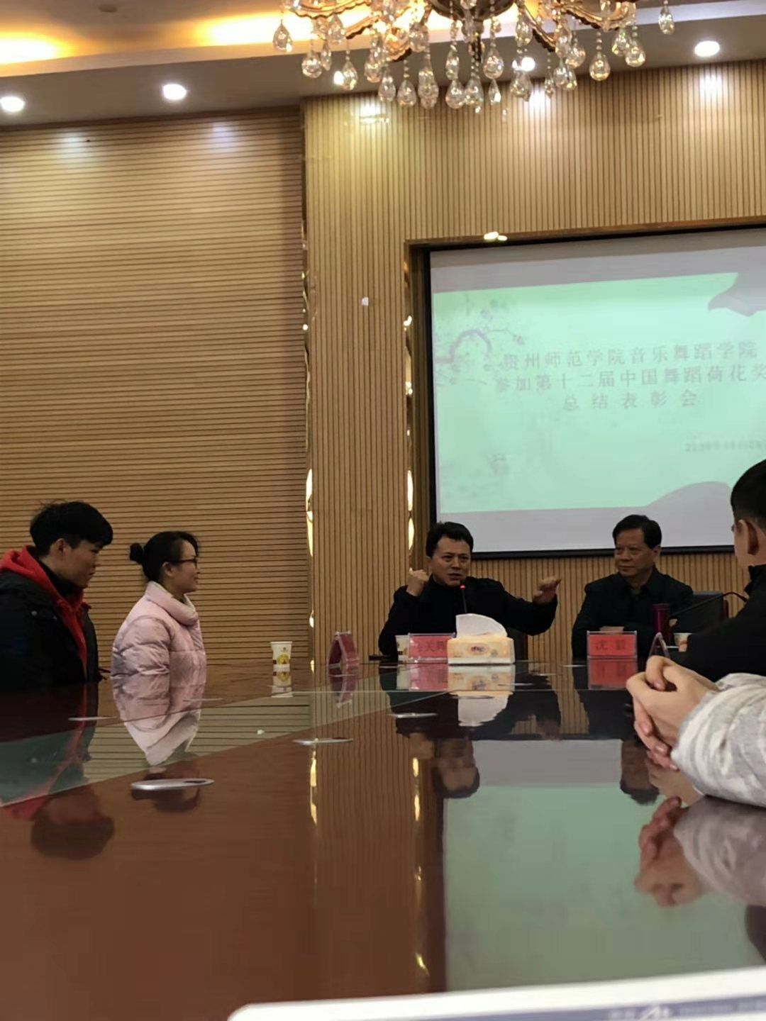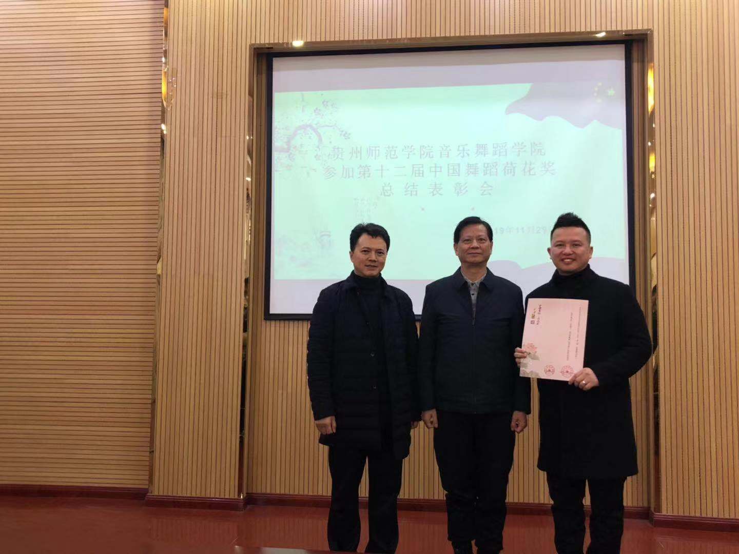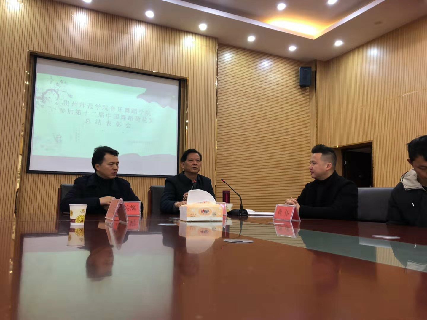 2019年11月29日,77779193永利官网集团在逸夫楼六楼会议室举行第十二届中国舞蹈荷花奖总结表彰会,贵州省舞蹈家协会主席沈毅、77779193永利官网集团院长马关辉,77779193永利官网集团舞蹈系主任肖伟,舞蹈系副主任高玉娟以及参加《贲牛搏角》的演出人员参加会议,会议由肖伟主持。
