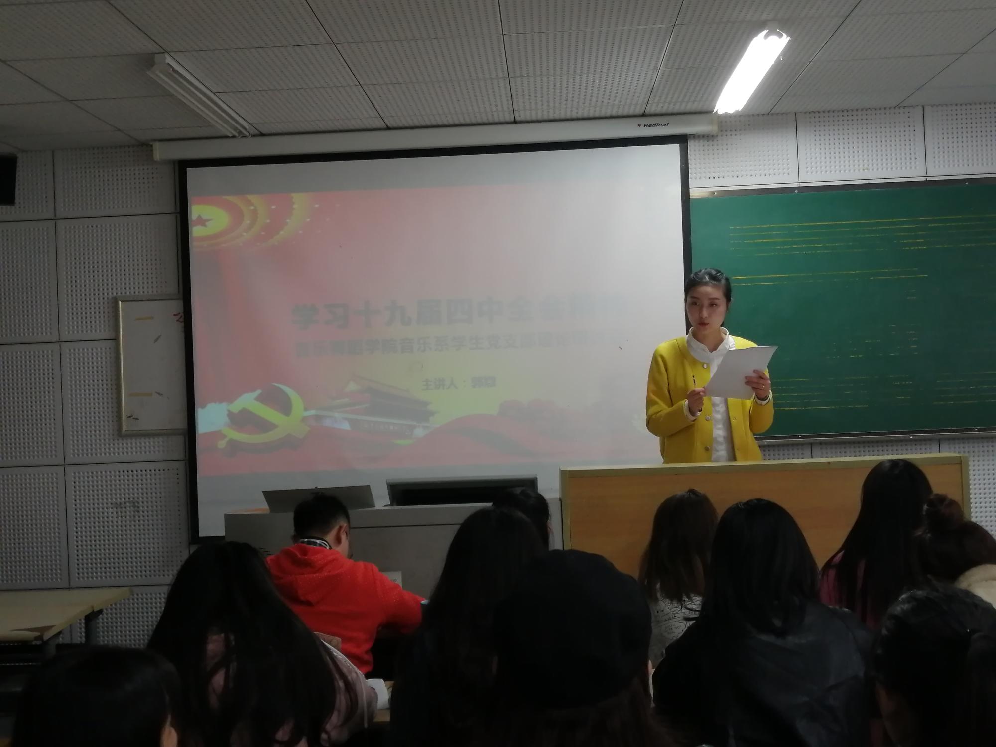 2019年11月19日中午,77779193永利官网集团音乐系学生党支部在逸夫楼A703教室开展关于党的十九届四中全会精神的理论研讨与学习。音乐系学生党支部书记舒然、组织委员郭媺以及全体学生党员参与本次会议,郭媺担任主讲人。