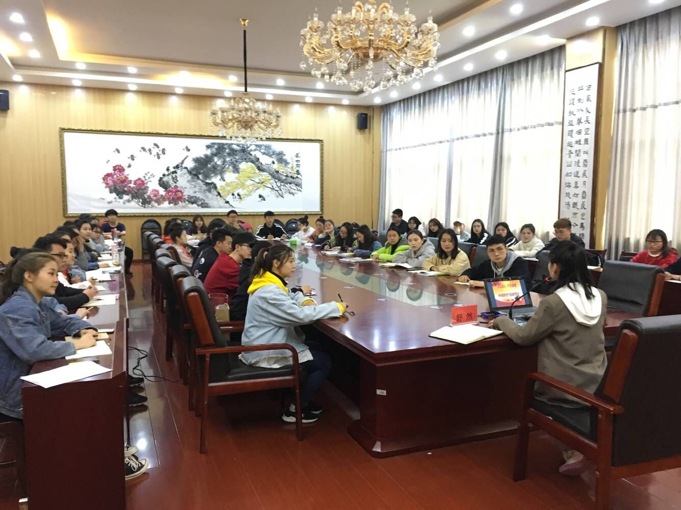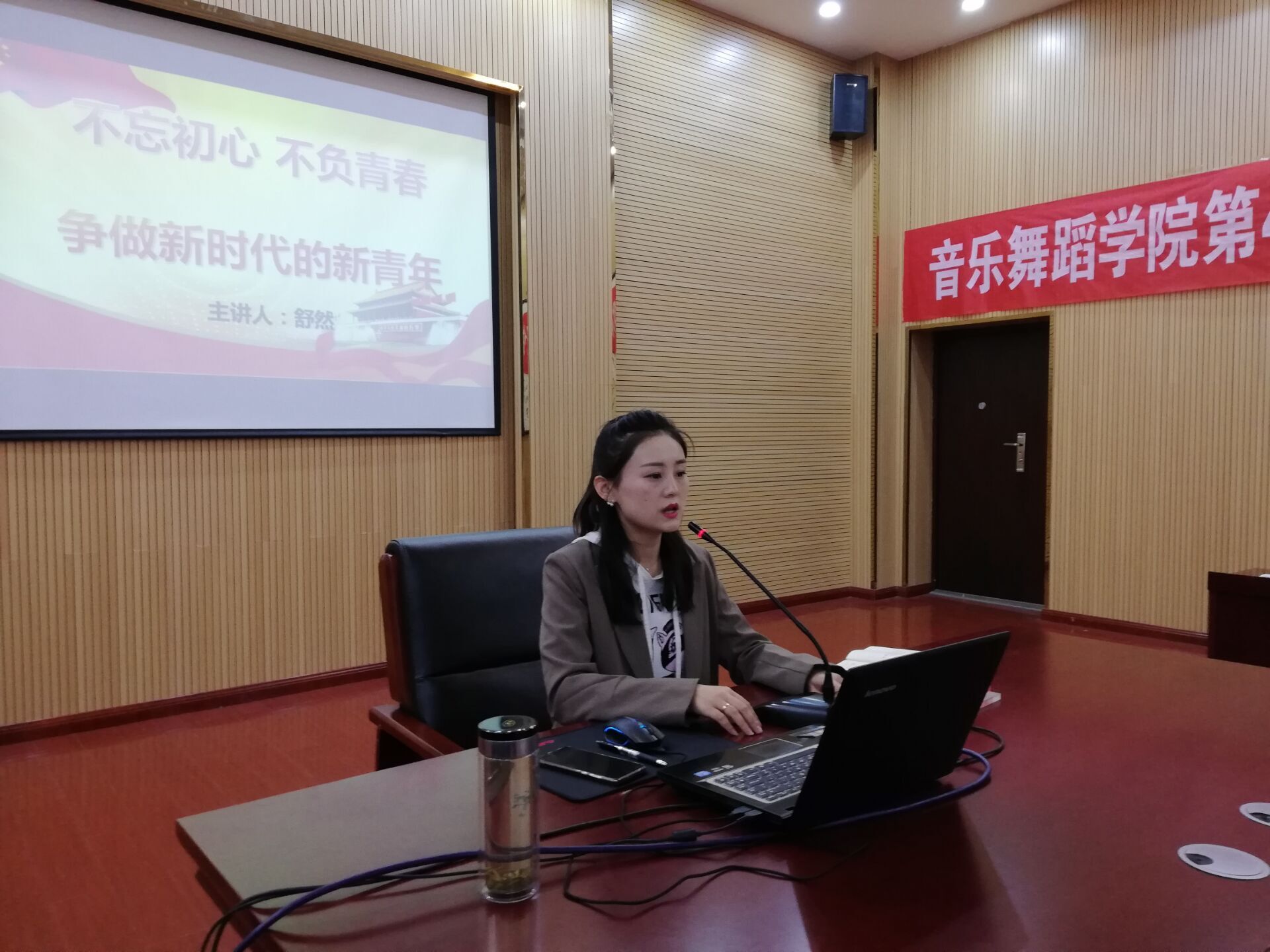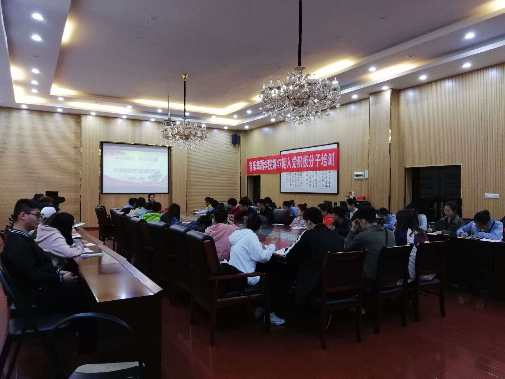 3月27日,77779193永利官网集团第47期入党积极分子培训“不忘初心,不负青春,争做新时代的新青年”专题讲座在逸夫楼六楼会议室召开。音乐系学生党支部书记舒然担任主讲人。