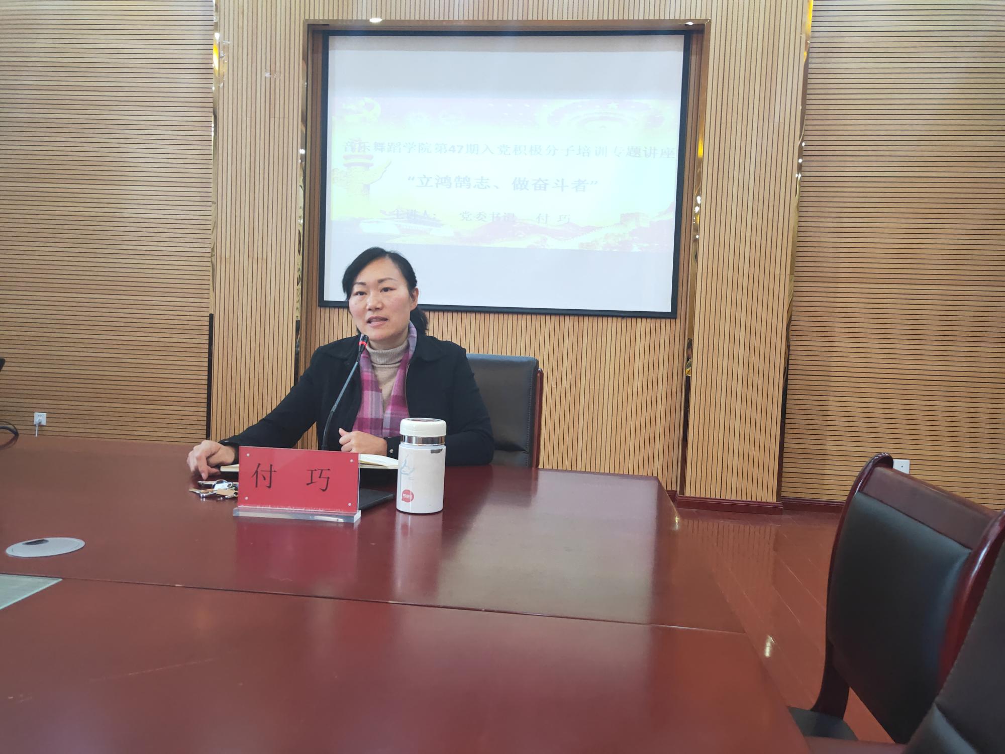 随后,付巧开展了主题为“立鸿鹄志,做奋斗者”的专题讲座。她从端正入党动机,要真信;努力学习,要真干;严格要求自己,要真严;有担当,要作为四个方面展开了精彩的讲座。学员们受益匪浅、感受颇深。