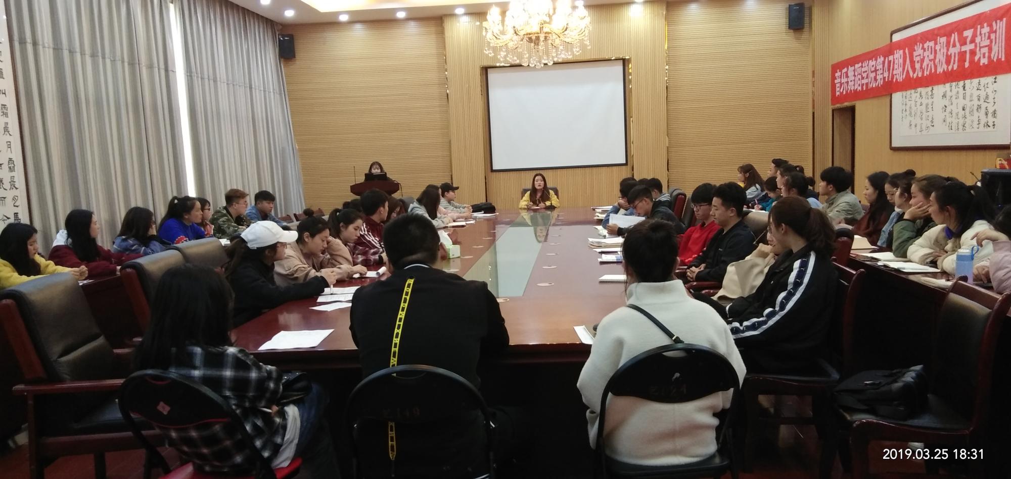 3月26日,77779193永利官网集团第47期入党积极分子培训在学院六楼会议室隆重举行。党委书记付巧、党委副书记朱晨刚、音乐系学生党支部书记舒然以及48名参训学员参加会议,会议由舒然主持。