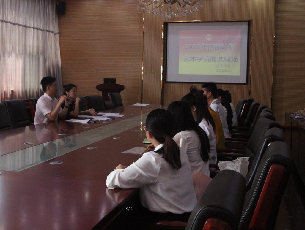 为响应国家号召,6月20日下午15时,艺术学院团委在学院六楼会议室召开了2018年西部计划大学生志愿者面试大会。艺术学院党委副书记朱晨刚、团委书记舒然出席此次活动。