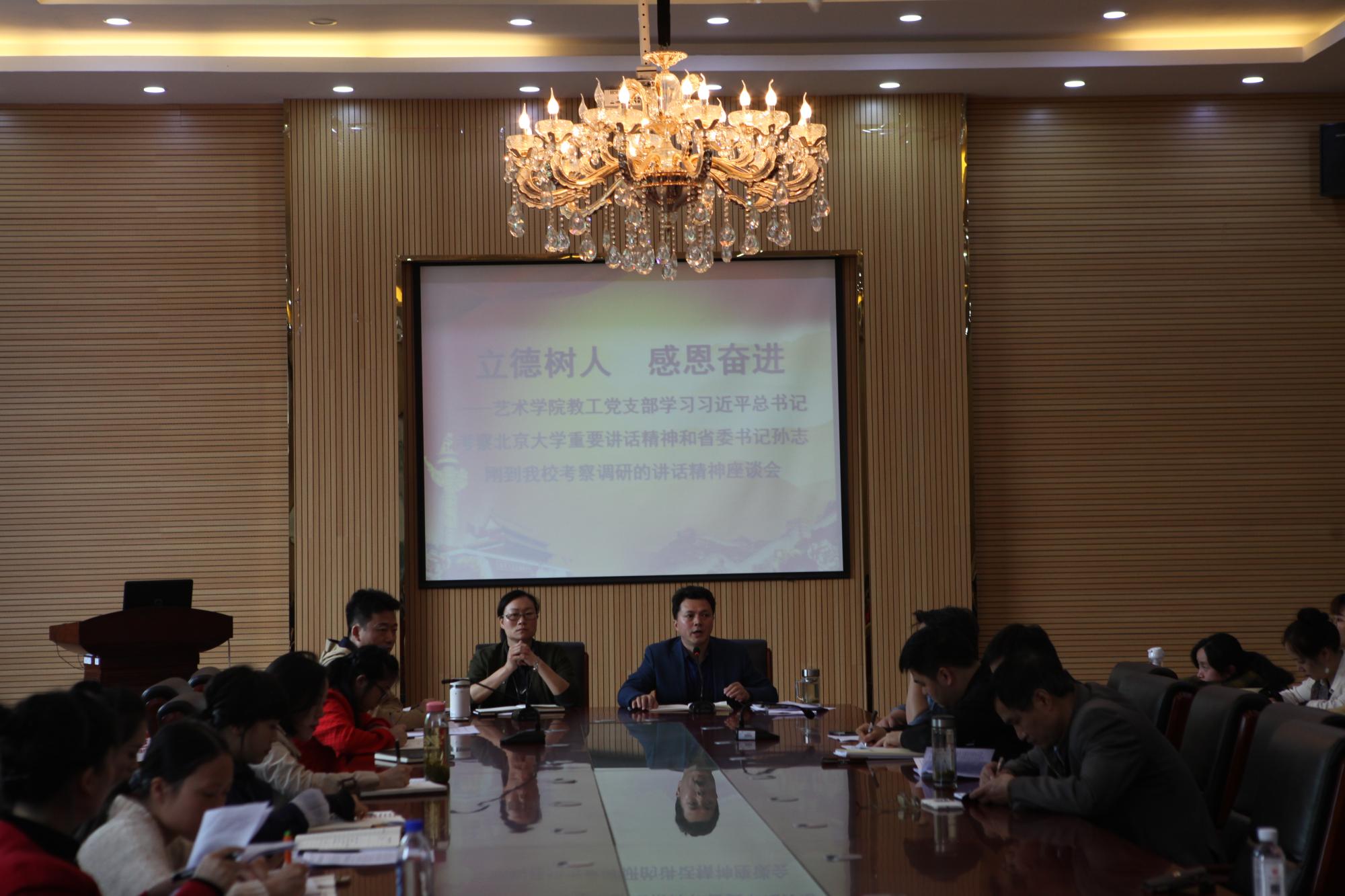 5月16日,艺术学院全体教职工在会议室召开专题研讨会。研讨会以“‘吐辞为经、举足为法’,争做学生健康成长的引路人”为主题,紧紧围绕习近平总书记在北京大学师生座谈会上的讲话精神和省委孙志刚书记到我校视察的讲话精神展开。研讨会由教工党支部书记陈玉莲主持。