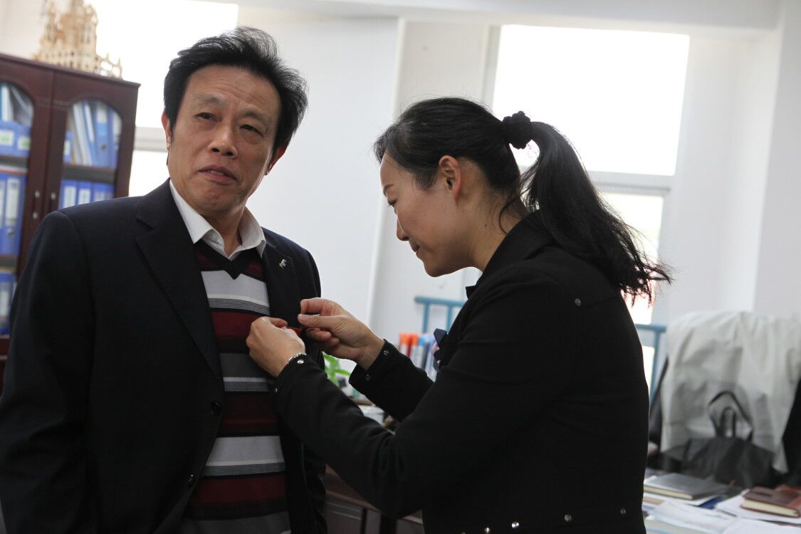 为老干部佩戴校徽