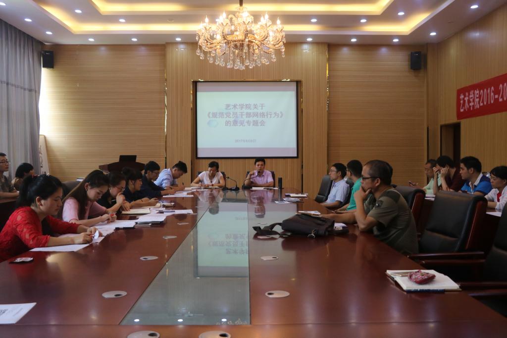 根据省委教育工委《省委教育工委关于转发<关于规范党员干部网络行为的意见>的通知》(黔教(委)社发〔2017〕26号)有关文件要求,为了进一步规范我院党员干部网络行为,营造健康向上、风清气正的网络环境,推动学院健康发展,9月8日中午,艺术学院全体教职工在学院会议室集中学习了《关于规范党员干部网络行为的意见》。艺术学院党委书记付巧,院长马关辉、党委副书记朱晨刚及全体教职工参加了学习。