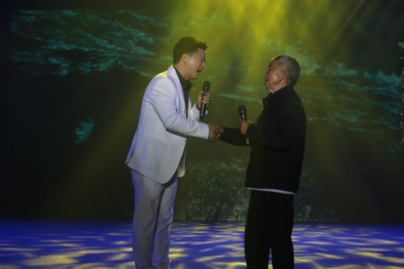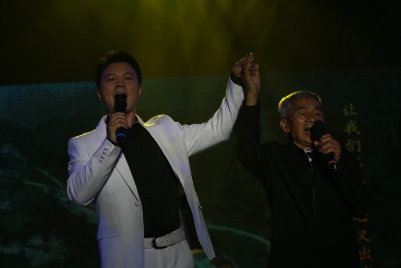 演唱中,马关辉教授不由自主的走下台去,小心谨慎地把82岁高龄的黄大发老支书扶到舞台上,拉着老支书的手饱含深情的演唱把整个活动推向了高潮。
