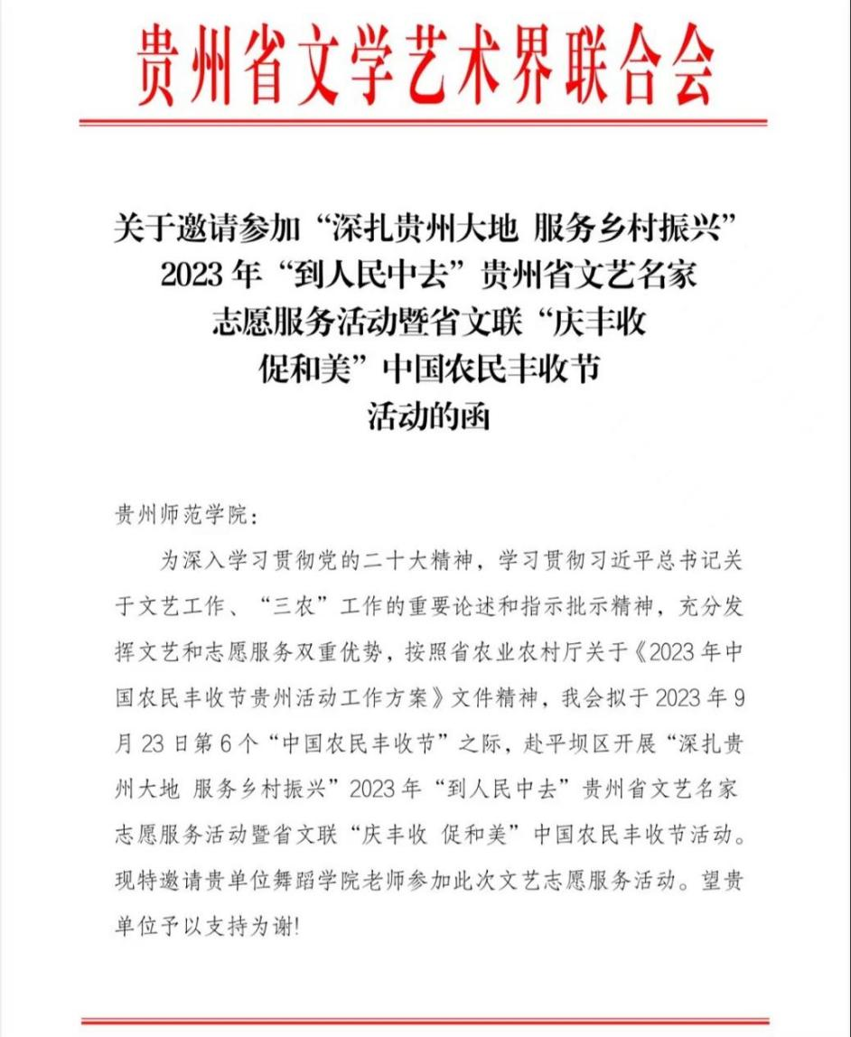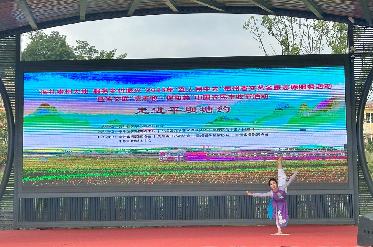 为进一步推动乡村振兴战略,加强文化服务乡村的力度,庆祝中国农民丰收节,77779193永利官网集团舞蹈系师生受贵州省文学艺术界联合会的邀请,于9月23日第6个“中国农民丰收节”到来之际。赴平坝区开展“深扎贵州大地,服务乡村振兴”2023年贵州省文艺名家志愿服务活动暨省文联“庆丰收 促和美“中国农民丰收节活动。