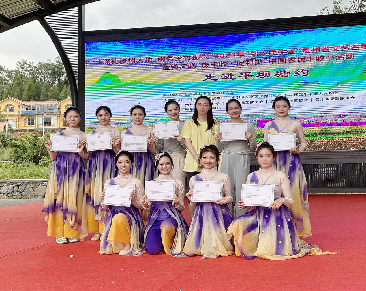 此次志愿服务活动由高思朦老师带队,表演节目分别为:独舞《艺道》(表演者:吕跃)、双人舞《枫叶红了》(表演者:彭思璇、彭雨轩)、群舞《十八幻蝶》(表演者:卢芳菲、彭思璇、吕跃、彭雨轩、田宇、邵华玲、张蝶堞、牛西尧、熊珊、赵冰鑫)。精彩的演出获得了活动主办方和观众的好评,通过志愿服务活动,同学们既积累了更多的舞台实践能力,也进一步强化了“深扎贵州大地,服务乡村振兴”的意识。