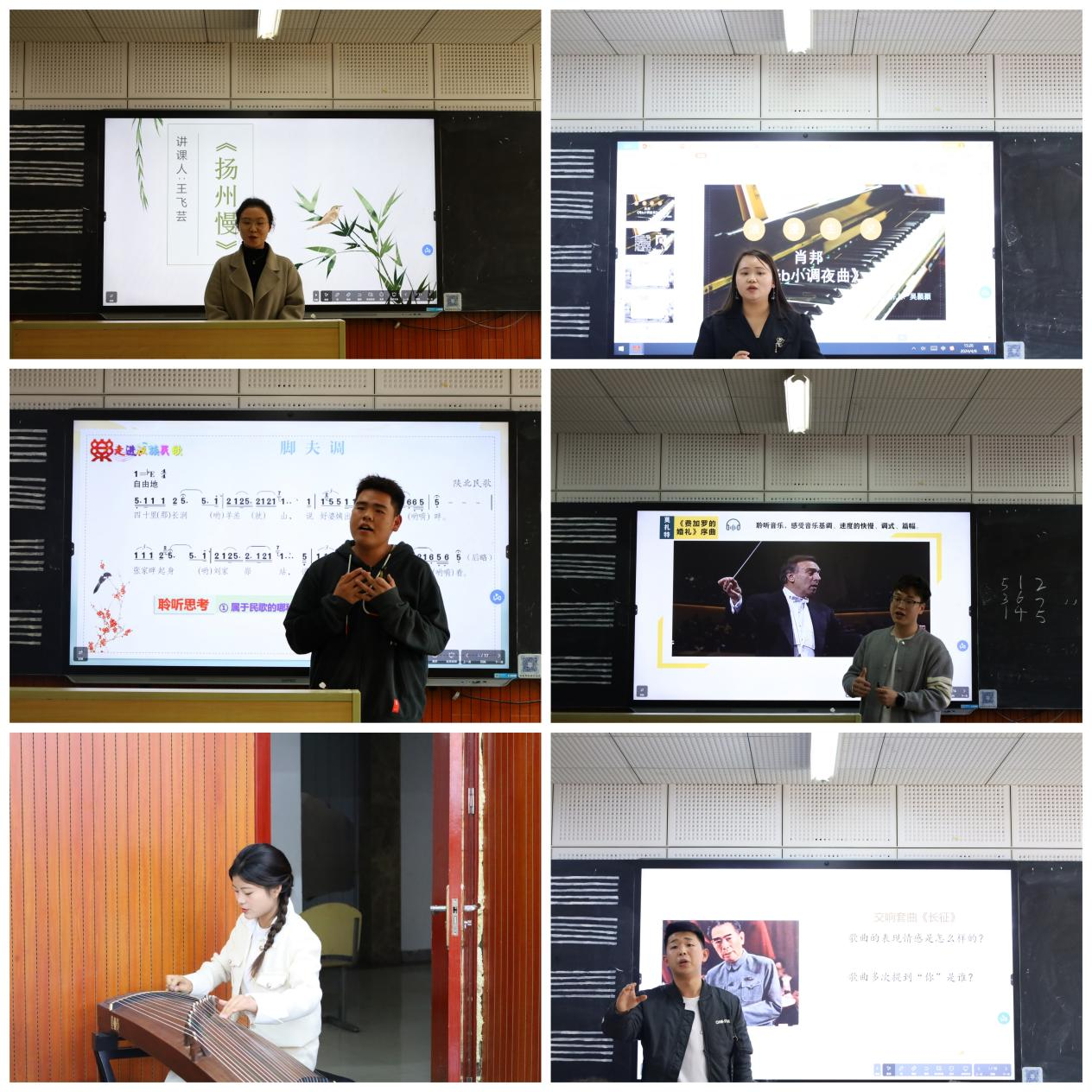 在紧张而有序的比赛中,选手们充分展示了自己的教学能力和创新能力。他们通过歌曲演唱、舞蹈表演、乐器演奏等多种形式,展示了良好的教学基本功,同时,他们还注重与学生的互动,营造了轻松愉快的课堂氛围,不仅展示了教学技能,也展现了对音乐教育的热爱。在赛后评委点评环节,三位评委老师依次发言,对同学们在比赛中展示的亮点予以肯定,对参赛选手们在课堂教学中存在的不足予以指正。所有参赛选手和部分指导教师观摩了比赛及赛后点评,大家感到受益匪浅。同学们一致表示,今后会更加努力钻研教育教学方法,不断提升教育教学能力,为在将来能够成为一名优秀的音乐教师而不懈努力。
