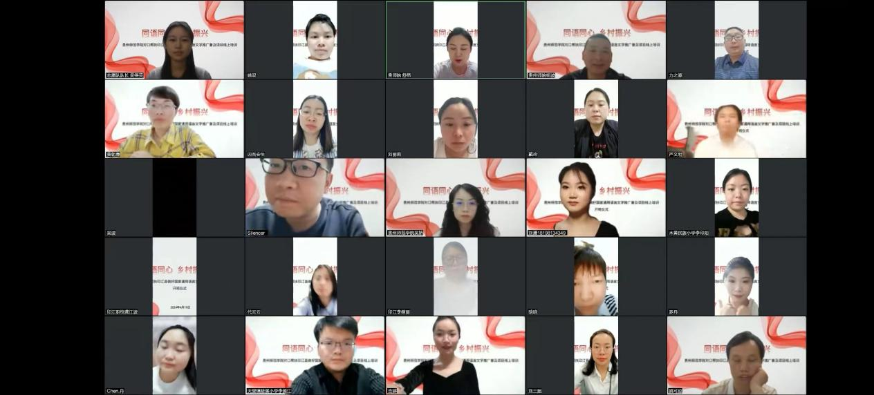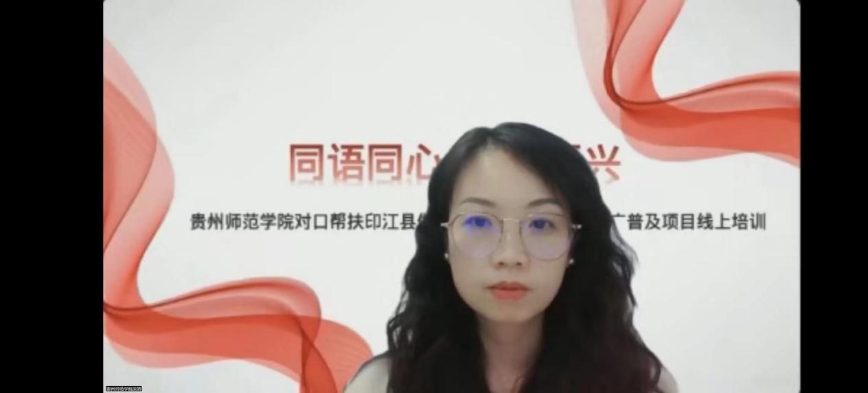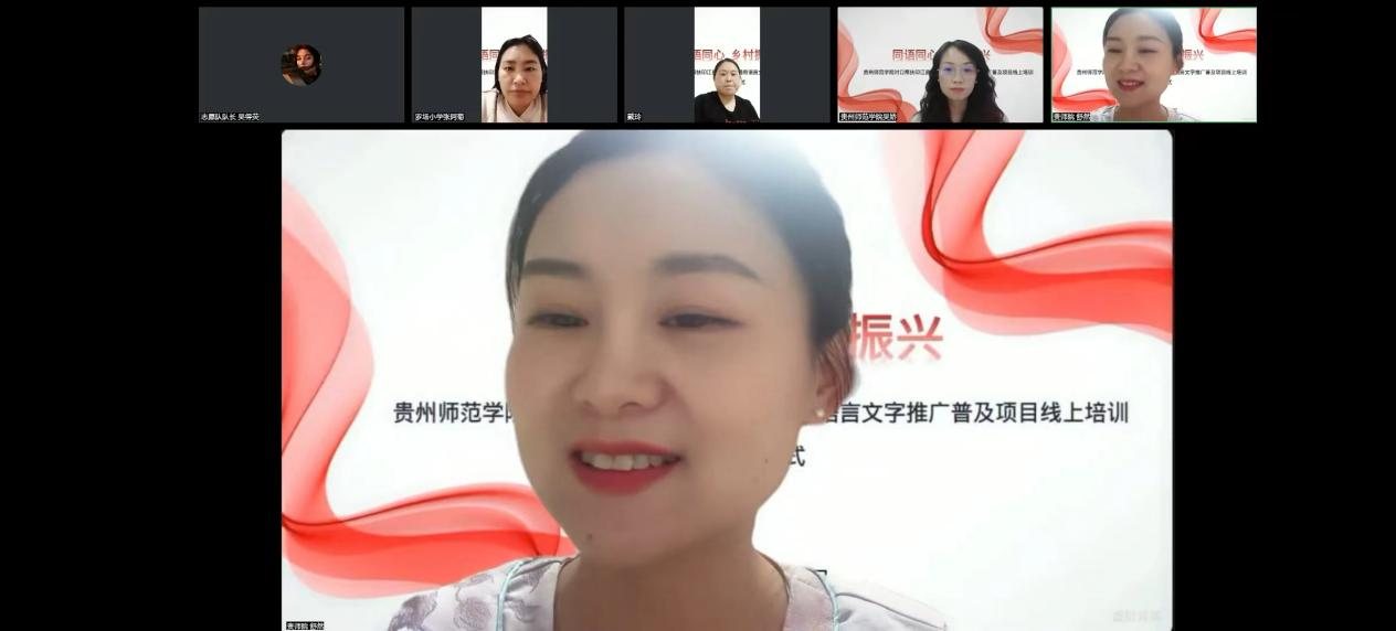 会上,吴娇传达了《贵州省教育厅办公室关于实施高等学校对口帮扶乡村振兴重点帮扶县做好国家通用语言文字推广普及项目的通知》文件精神,并就项目背景进行说明;舒然介绍了第一阶段普通话培训“1+10线上督学”计划;杨旭东宣读推普志愿者结对教师名单;任倩用“三个强调”就参训教师线上培训期间的学习纪律提总体要求;杨波就培训的具体举措、语言文字推广的重要性进行总结讲话。