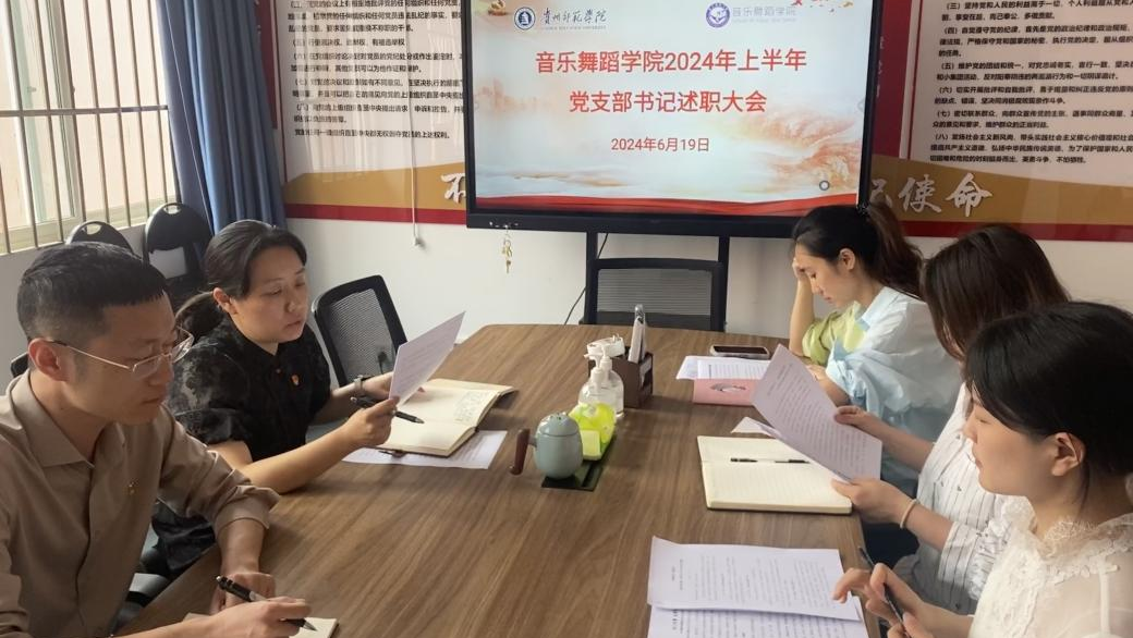 教师党支部书记谭娇艳、舞蹈系学生党支部书记李金容、音乐系学生第二党支部书记邹力征、音乐系学生第一党支部书记舒然分别就2024上半年支部工作进行了汇报。