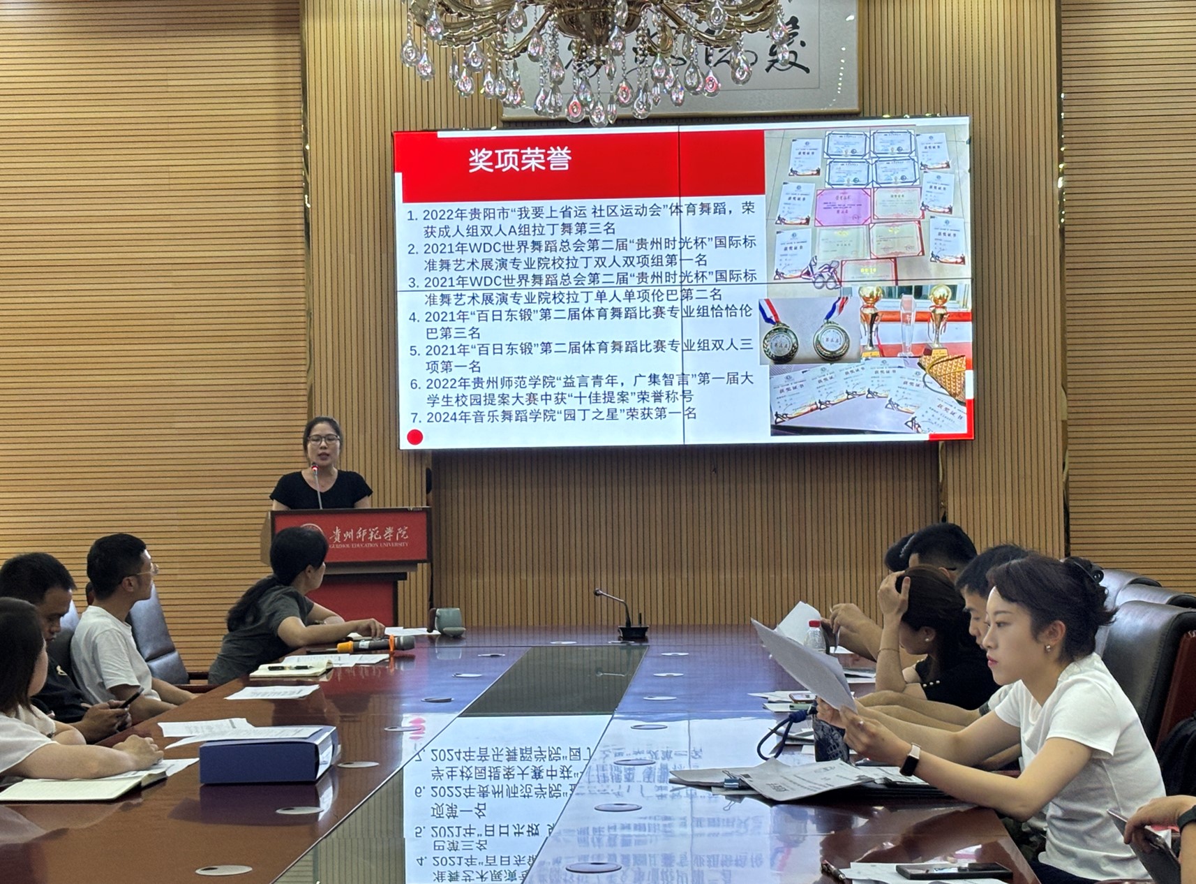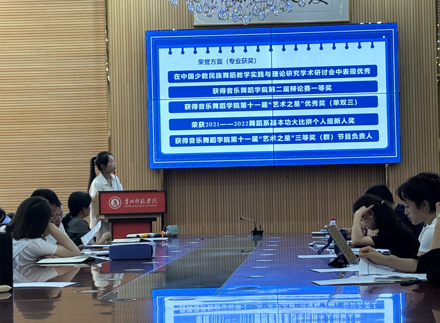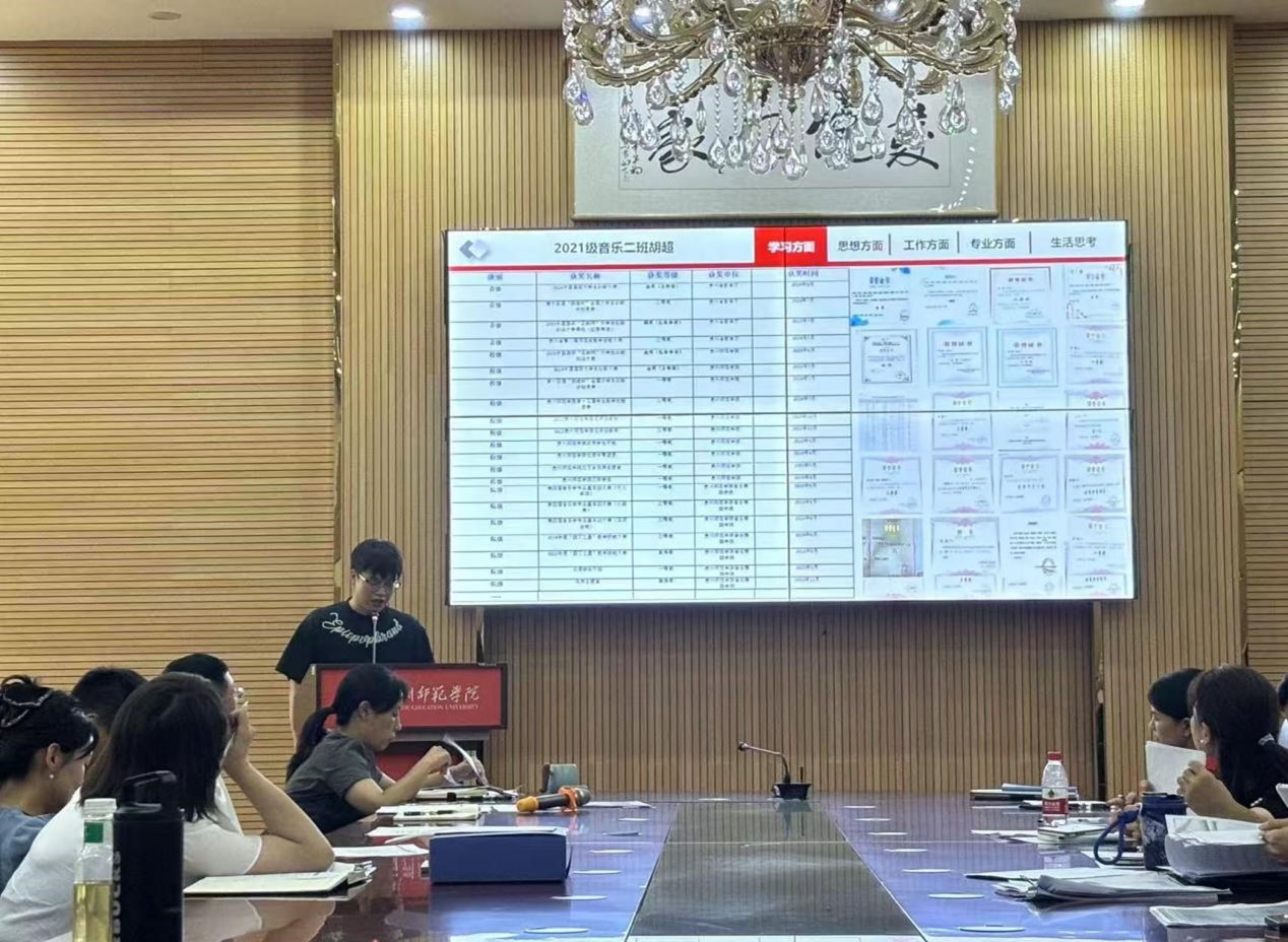张颖欣、史佳、李菲、代江玉、吴得荧、胡超等六名候选人依次进入会议室进行汇报。随后,各班辅导员对本班候选人进行补充说明。辅导员从不同角度对候选人进行了评价,为评选工作提供了更加全面的信息,参会老师认真查阅学生奖学金的申报材料。