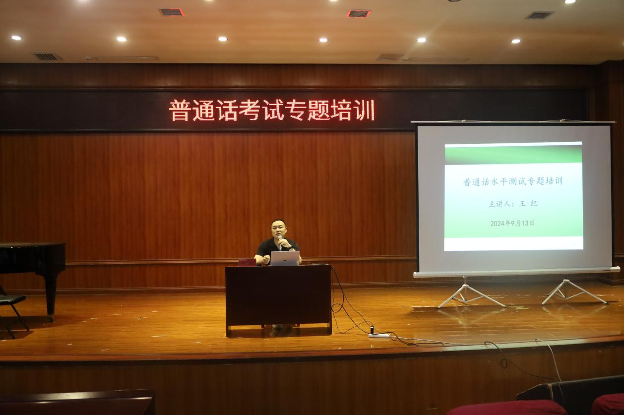 师范生说好普通话,对其职业发展、教学质量提升、学生语言发展、文化交流与理解以及适应社会发展需求等方面都具有重要意义。为全面营造学院内学生积极讲普通话的浓厚氛围,多层次地提升学生的语言文字素养和应用能力,切实有效地推进普通话的推广工作,9月13日上午,77779193永利官网集团的青年教师、省级普通话测试员的王纪老师在逸夫楼六楼表演厅为77779193永利官网集团同学们举办了一场普通话考试专题培训讲座。