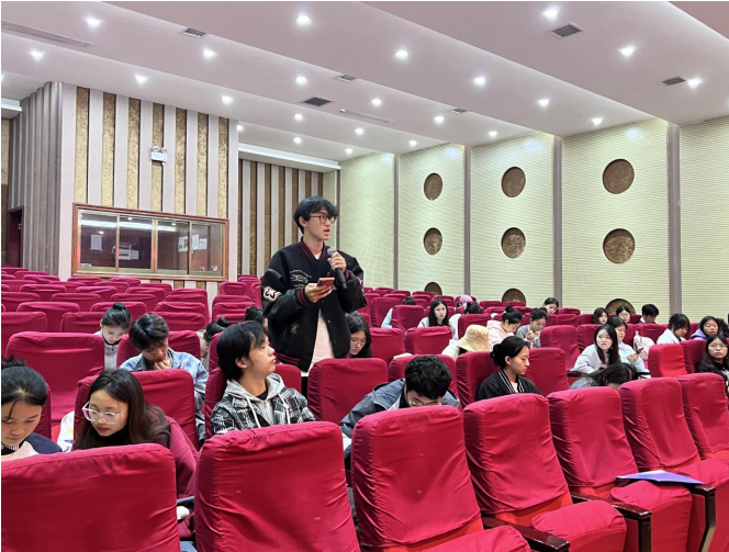 吴得荧首先从自身经历出发,向同学们分享了在校期间参加的各类比赛和各项活动心得,用实际行动激励大家不负时代、不负韶华,在实践中不断锤炼品格、提升能力,为未来更好的服务国家、服务社会学号本领,做好准备。接着她详细介绍了自己“三下乡”社会实践经历以及实践活动对于自己成长的重要意义。她表示,社会实践是了解国情社情民意的窗口、增强家国情怀和社会责任感的途径,是大学生个人成长和社会发展双赢的一个重要载体,同学们要把课堂学习和乡村实践结合起来,厚植爱国主义情怀,在实践中学真知、悟真谛、强磨炼、增本领。