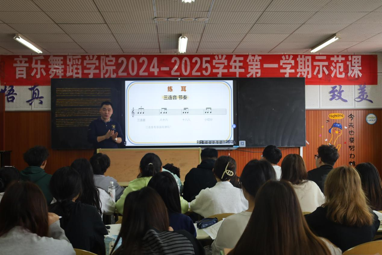 刘科老师展示的示范课程是《视唱练耳Ⅰ》,授课对象是2024级音乐学一班学生。课上,刘老师运用多种方法讲解视唱技巧,从节奏把握到音准训练,生动且细致地把每一个知识点进行透彻地解析。练耳环节更是趣味十足,通过丰富多样的授课方式,提升大家对音高、节奏、音色等要素的听辨能力。