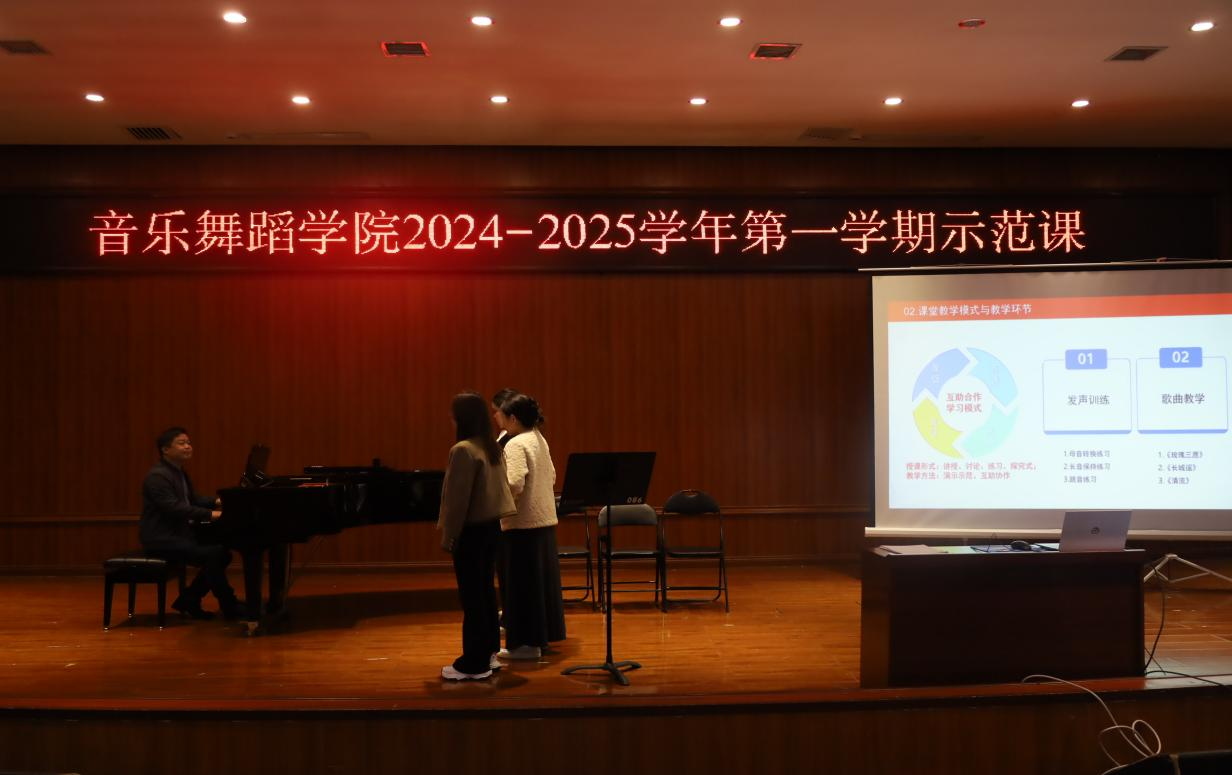 王晓老师展示的示范课程是《声乐教学与演唱Ⅰ》,授课对象是2022级音乐学专业声乐方向学生。在课上,王老师按照“三性一度”的“金课”标准(思政性、高阶性、创新型、挑战度)进行教学设计,以学生为中心展开课堂教学,采用学生“互相-互练-互评-互促”协作学习模式开展声乐发声训练和歌曲教学,并且在《玫瑰三愿》《长城谣》这些歌曲的教学中自然融入爱国主义教育,使学生不仅提升了演唱技能、声乐教学技能的同时,也在思想上受到了触动。