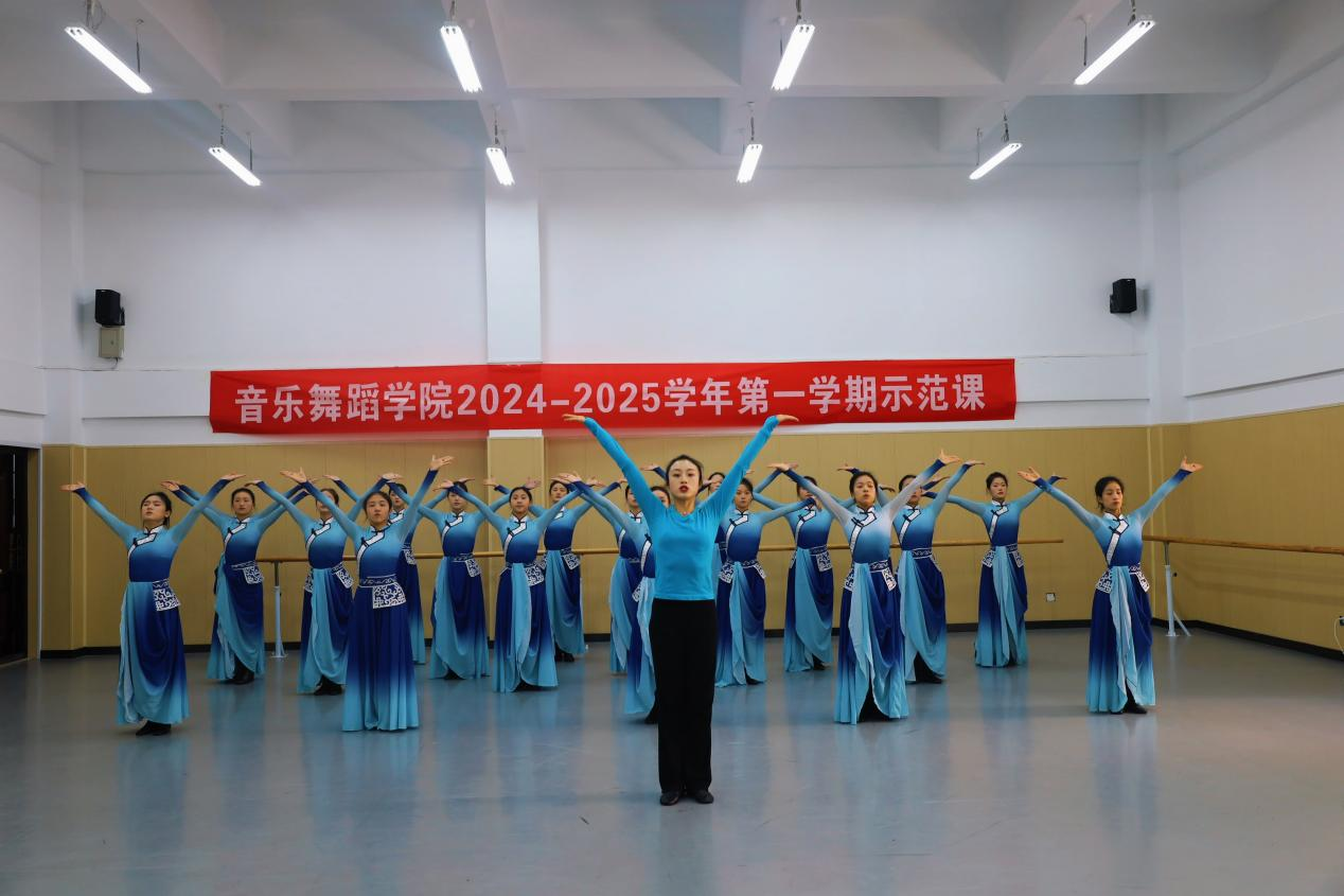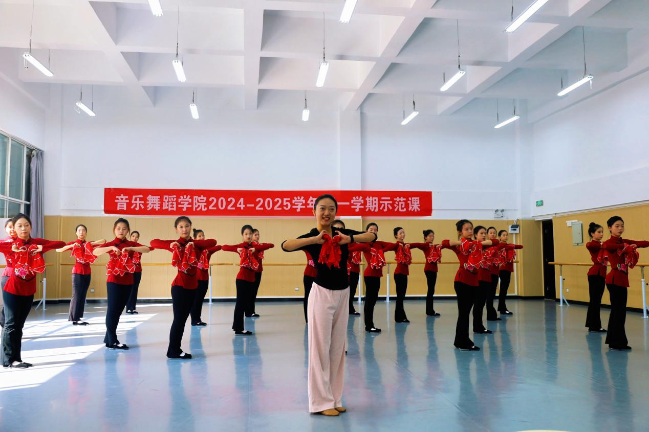 黄河老师展示的示范课程是《中国民族民间舞Ⅰ》,授课对象是2024级舞蹈学专业女班学生。中国民族民间舞蹈明快有节奏,悍健有力,富有民族风格和浓郁的生活气息,在该节示范课的教学中,黄老师针对民族民间舞蹈的体态与韵律组合、腕部训练组合进行讲解和示范,并对动作不规范的同学进行了有效指导。
